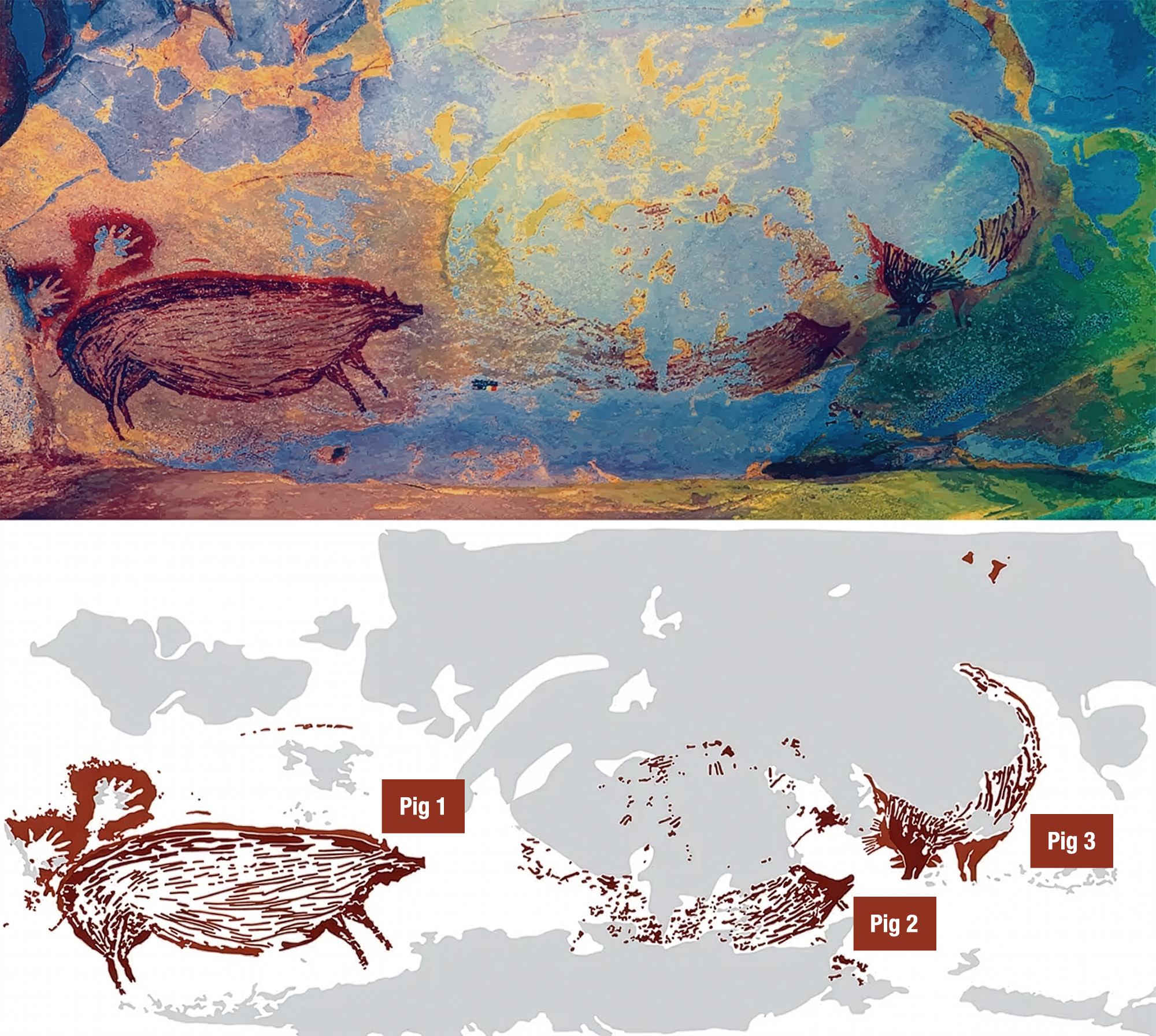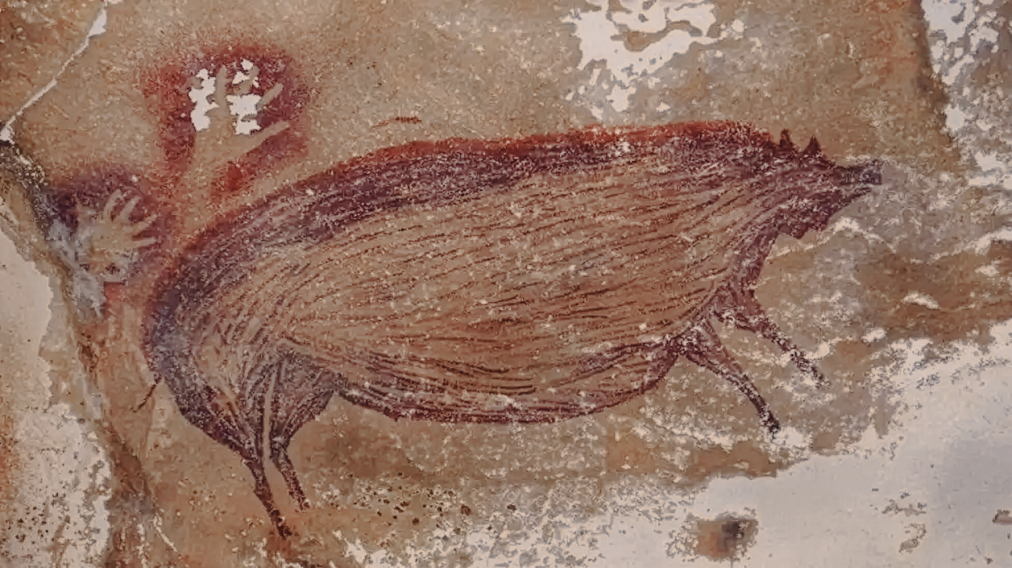 The first narrative scene may have arrived with 'Leang Bulu' Sipong 4, a cave discovered in 2017 which Aubert has since studied. Also located in Sulawesi, this art is at least 43,900 years old and shows a series of hybridized animal-human figures hunting pigs. “It’s the first evidence of storytelling,” Aubert says. “The narrative scene was special because I’ve never seen anything like it.”