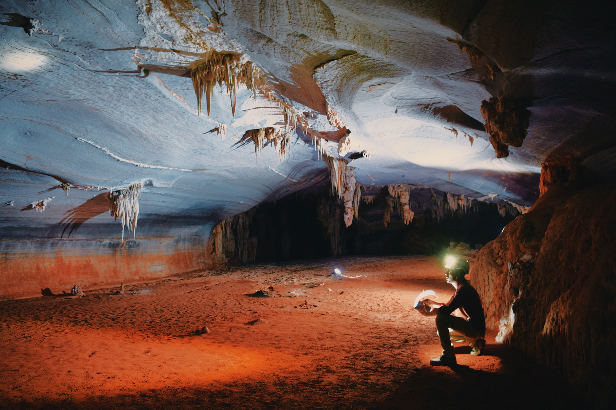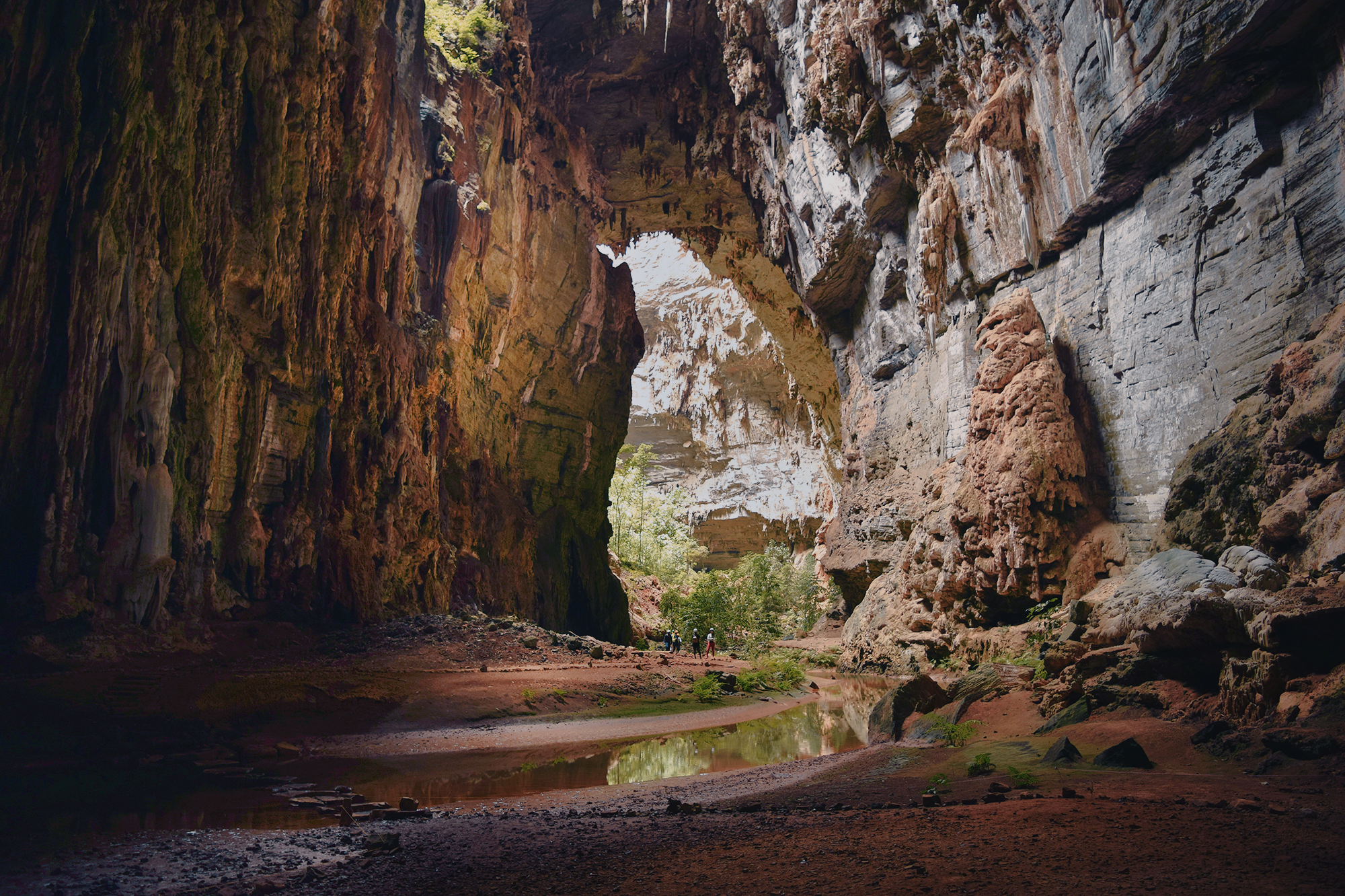 The Janelão (“big window”) is the principal attraction of Peruaçu National Park. Its scale is immediately striking, expressed in a large mouth, vast dolines, immense chambers, and monumental speleothems. The cave is home to the largest stalactite ever recorded, known as “The Ballerina’s Leg”, a staggering 28 meters in length, 2 meters shorter than the famous Christ the Redeemer statue, in Rio de Janeiro. The cave itself is 8 km long and has a vertical range of 180 meters. A series of natural skylights allows sunlight to penetrate the cave, creating small interior groves. The Peruaçu River runs through the entire cave and is one of its most distinctive features.