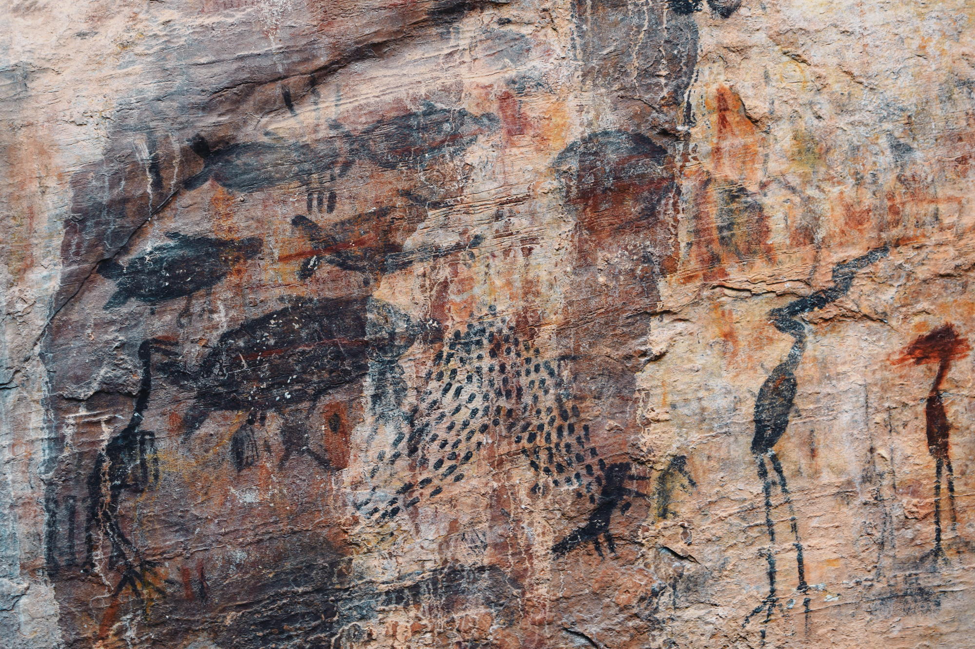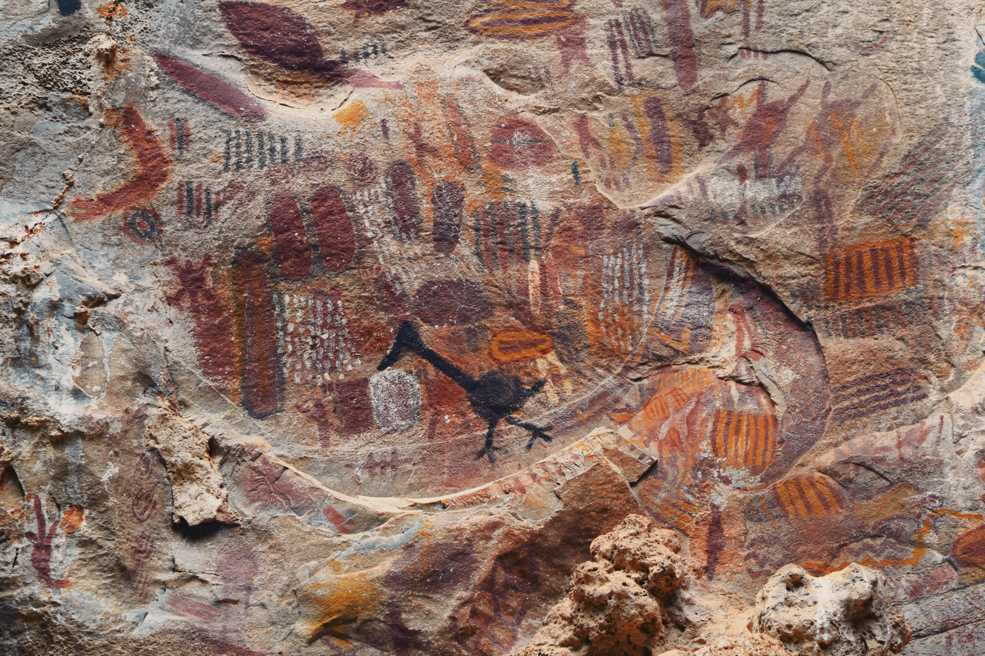 At the site known as Lapa dos Desenhos, literally, “Shelter of the Drawings”, the rock art of Peruaçu Caves National Park reveals its full expressive range, both in stylistic variation and in the diversity of techniques employed. The central panel, extending for several dozen meters in length and rising nearly ten meters in height, contains thousands of individual motifs. These range from abstract and geometric patterns to the distinctive cartucho motifs, compact, closed forms with filled interiors, often rendered in polychrome, and to figurative representations of animals and plants, most commonly painted in black. Among the zoomorphic figures, fish, birds, and lizards occur with particular frequency, suggesting that this segment of the surrounding fauna held distinct symbolic importance. Some panels at Lapa dos Desenhos were placed unbelievably high and necessitated perilous climbing, which could, in theory, indicate that rock art making was, at some meaningful level, associated with feats of dexterity and physical prowess.