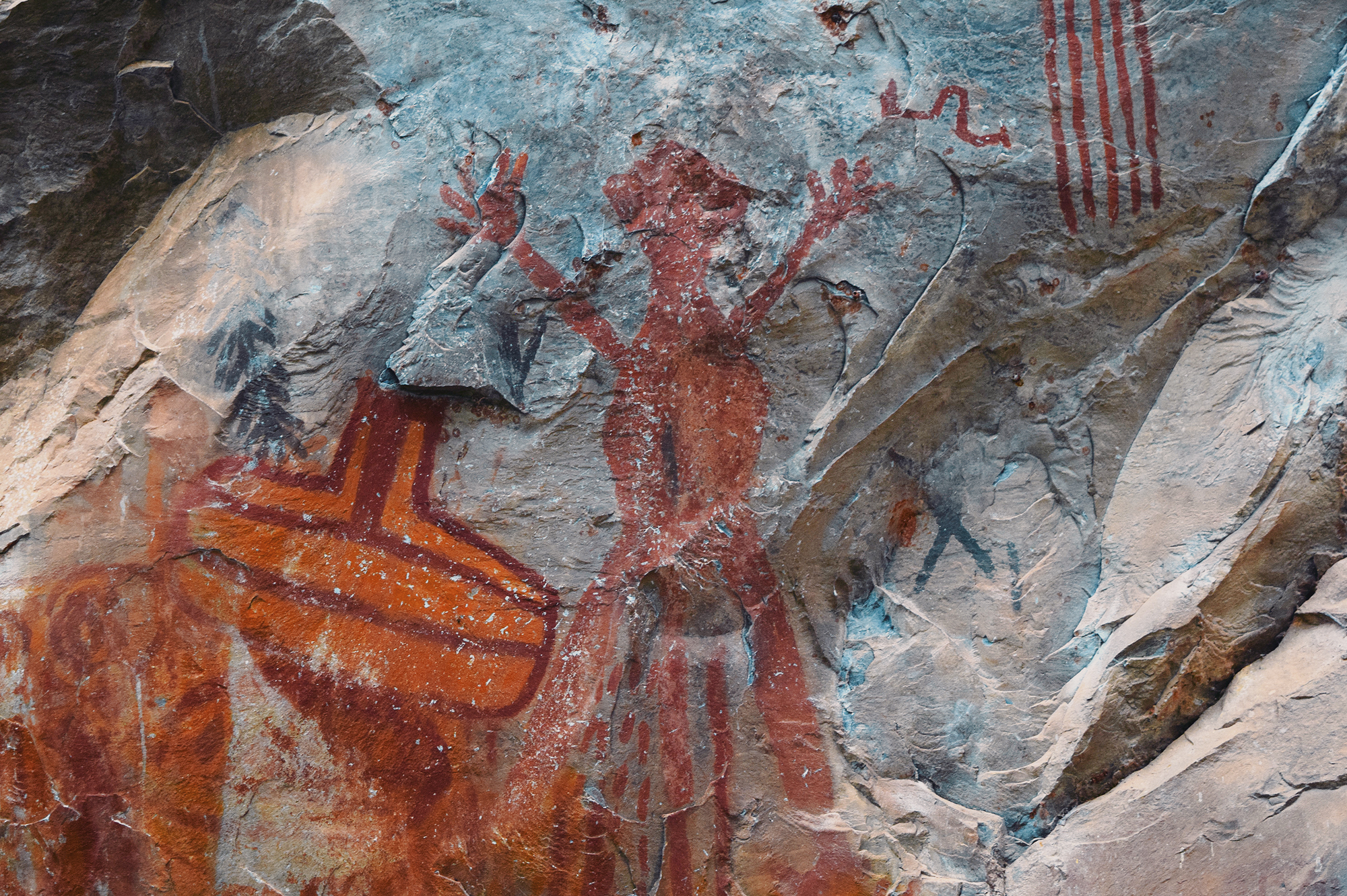 Excavations at the Lapa do Boquête site yielded radiocarbon dating indicating human occupation dating back almost 12.000 years before present. Furthermore, six burials were identified, dating to around 7.000 years before present, along with stone artifacts and structural features interpreted as habitation remains. The site preserves rock art panels combining both paintings and petroglyphs, comprising geometric designs as well as zoomorphic and anthropomorphic figures. Of particular interest is the large red Caboclo motif, along with a myriad of geometric designs in red, orange, purple, yellow, and black.