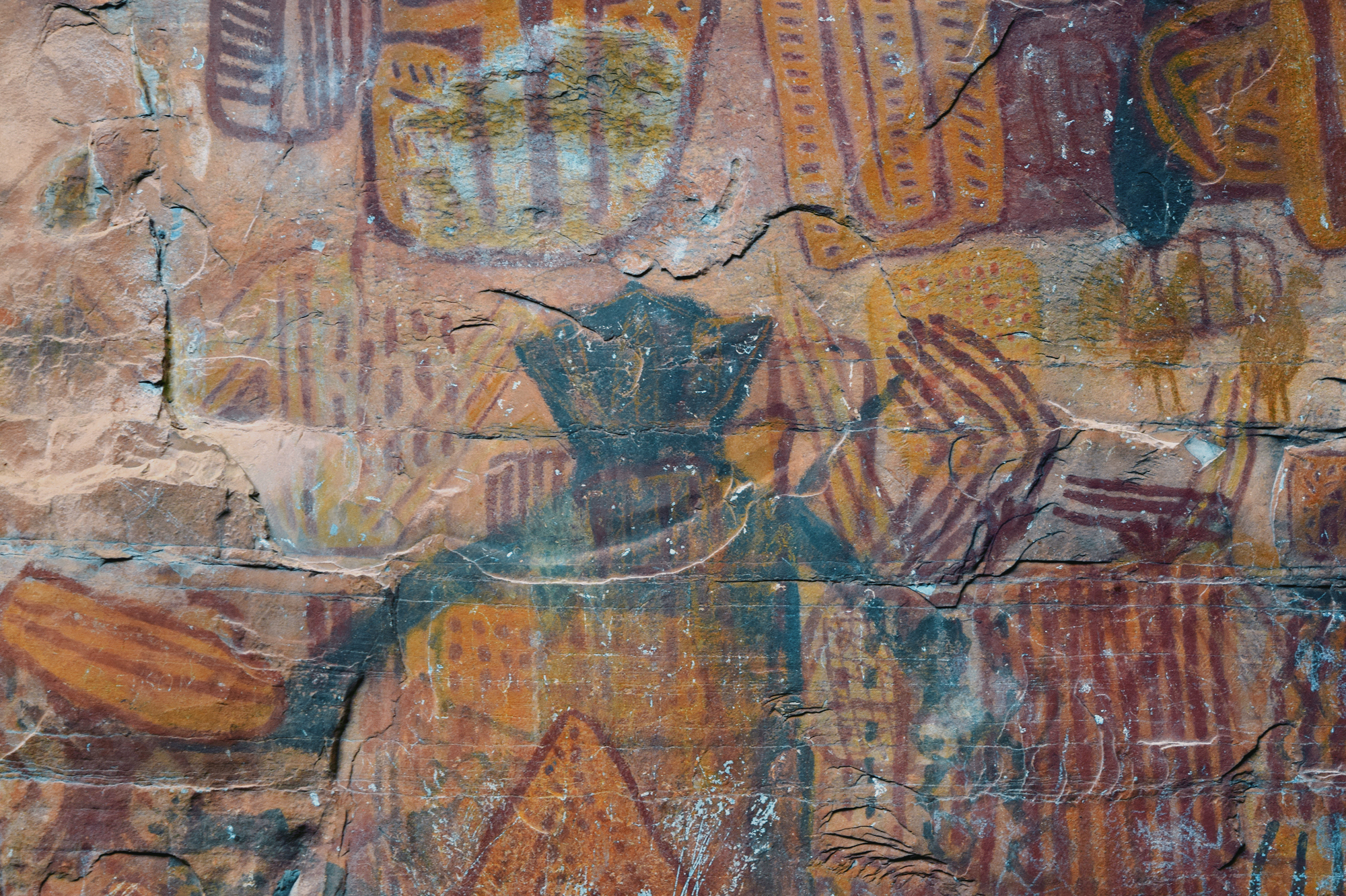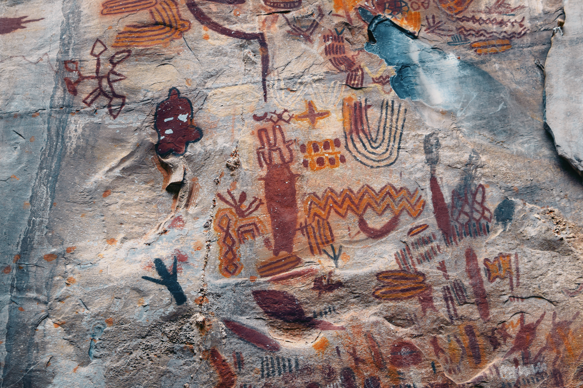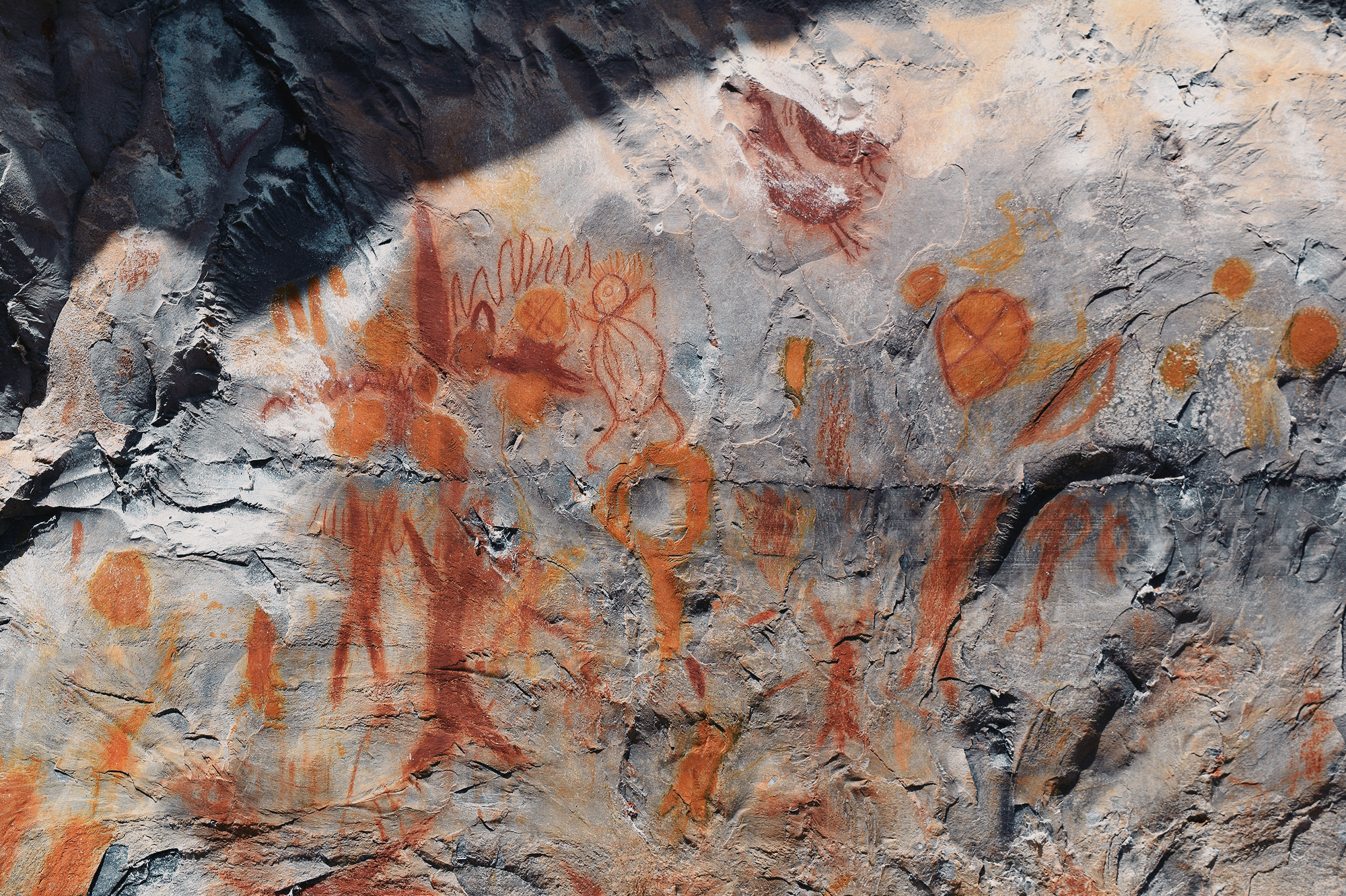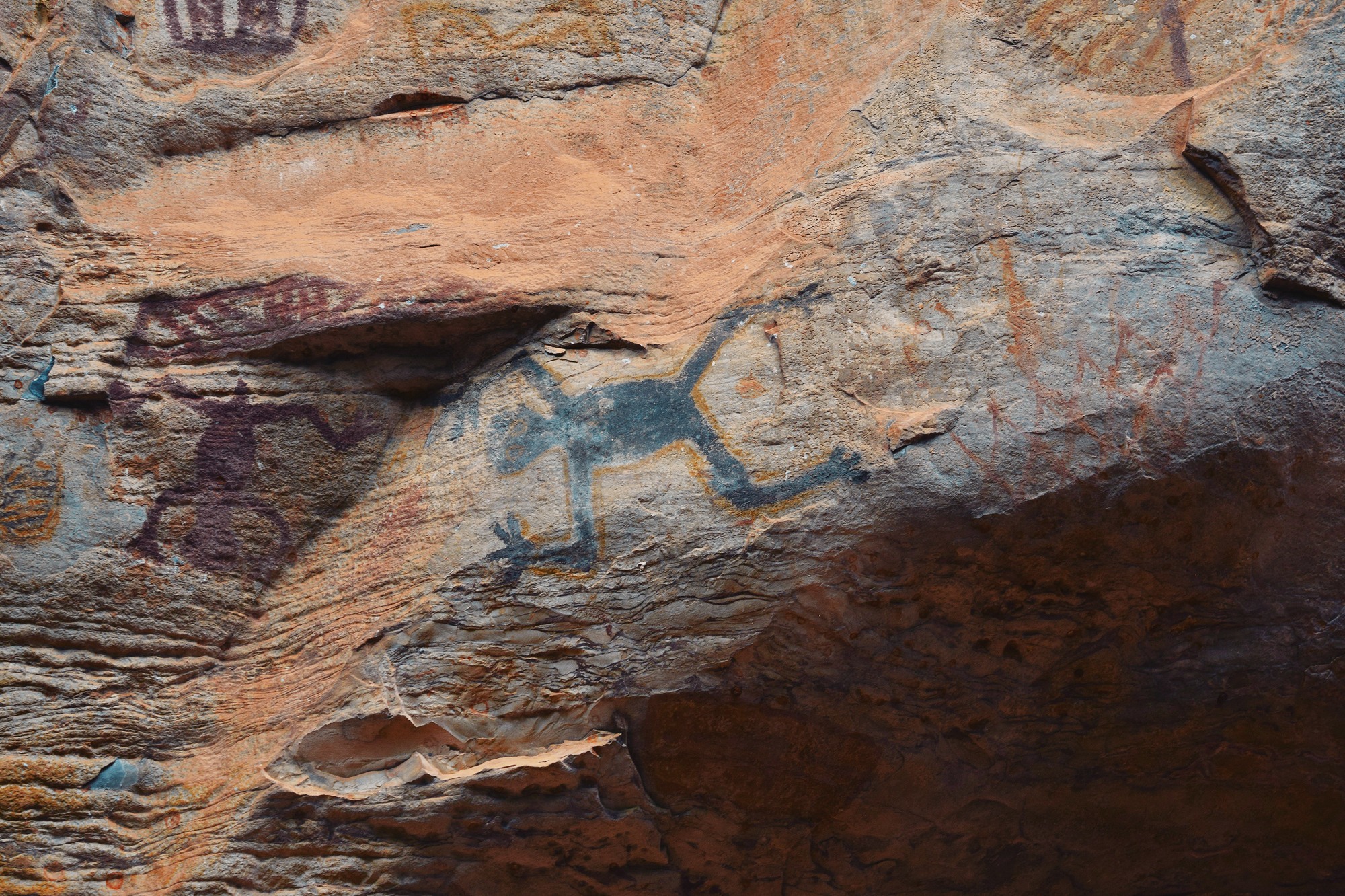 What immediately distinguishes Peruaçu from most Brazilian rock-art regions is its chromatic scope and scale. While red dominates painted rock art painting elsewhere, Peruaçu’s art is fundamentally polychromatic. Red, orange, yellow, white, and black, along with intermediate tones, were produced using charcoal, manganese dioxide, iron oxides and hydroxides, calcite, and carbon. This incredibly colorful corpus of paintings is sometimes placed as high as a 6-story building, a feat which evidently required scaffolding, ropes, or climbing trees and their branches. Research in the Peruaçu region began in the 1980s under the Archaeology Sector of the Federal University of Minas Gerais (UFMG). The initial goal was to characterize the paintings and define their stylistic units. Because the valley presents a dense, synchronous superposition of images, researchers adopted a crono-stylistic approach, seeking to disentangle stylistic affinities and relative chronologies.