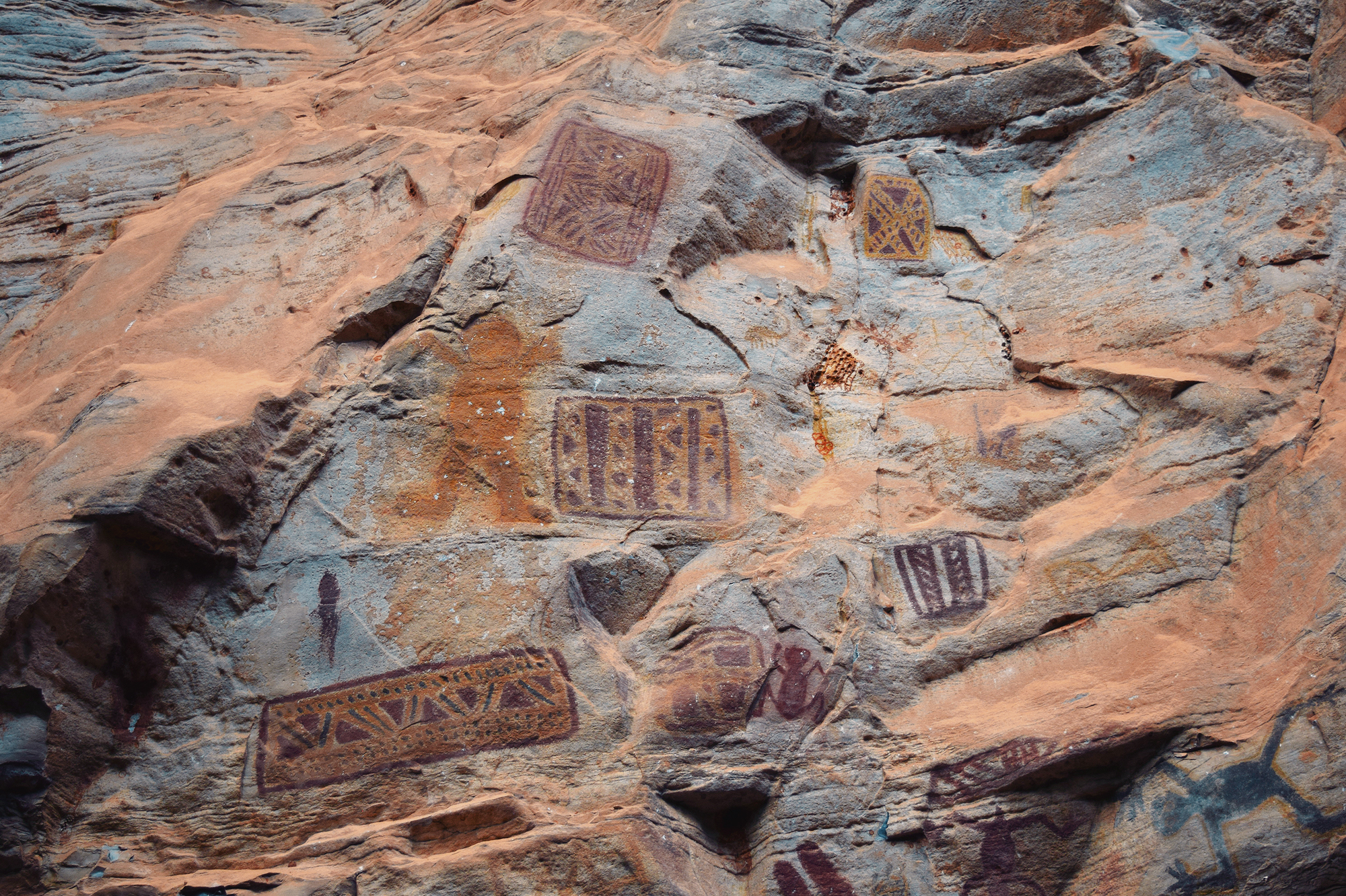 To date, six stylistic units have been identified in the Peruaçu Valley: the São Francisco Tradition, the Agreste Tradition, the Montalvânia Complex, the Piolho de Urubu unit, the Caboclo unit, and a particularly regional and faint expression of the Nordeste Tradition. These units do not correspond directly or necessarily to ethnic groups. Instead, they represent coherent visual repertoires, shared choices of form, color, technique, and placement, reflecting cultural affinities within and across populations. The São Francisco Tradition is the most prominent and best documented, and many units are part of the São Francisco cultural horizon. It is characterized by large geometric figures, often 30–40 cm in size, frequently executed in bichromy.