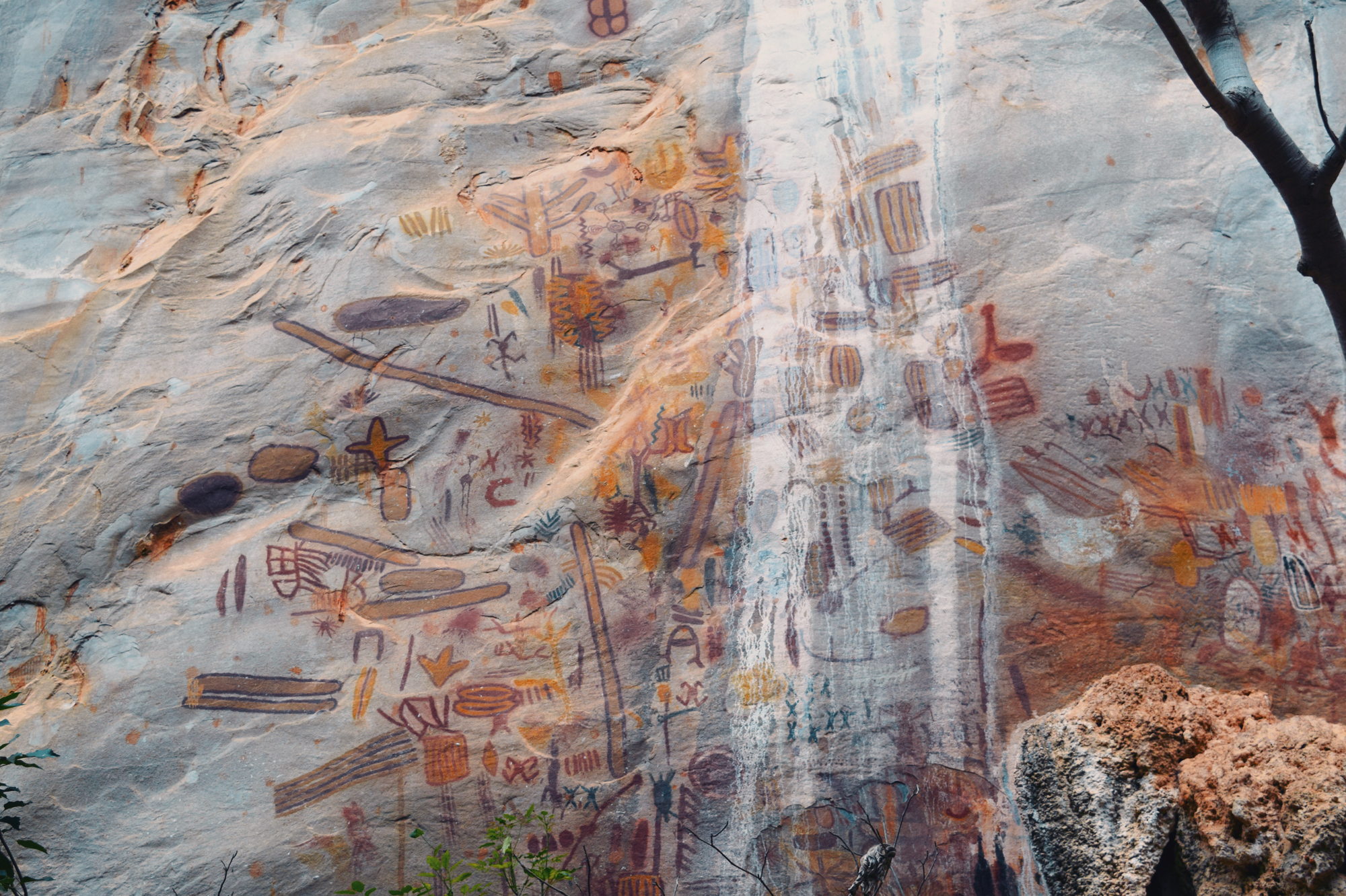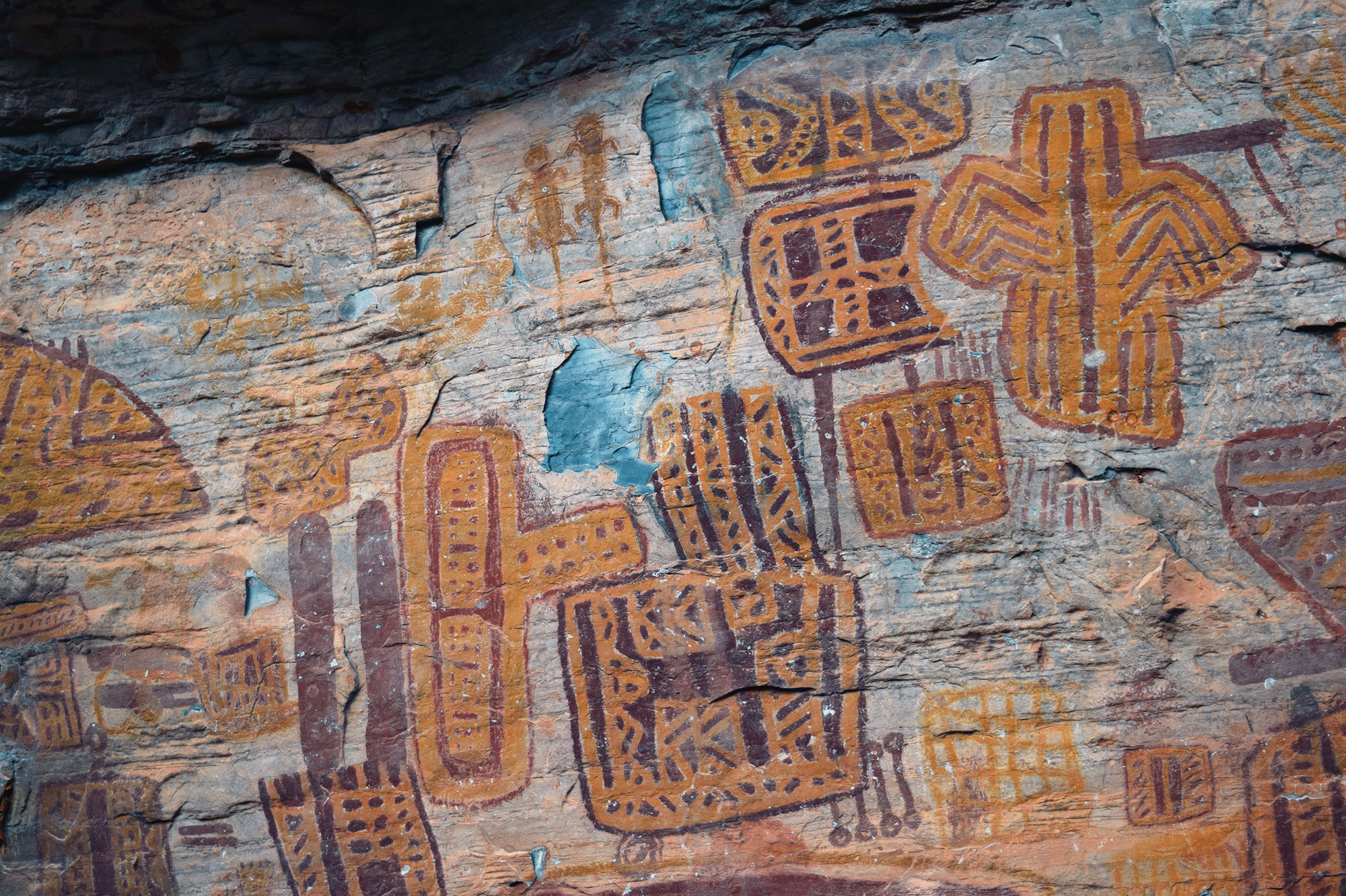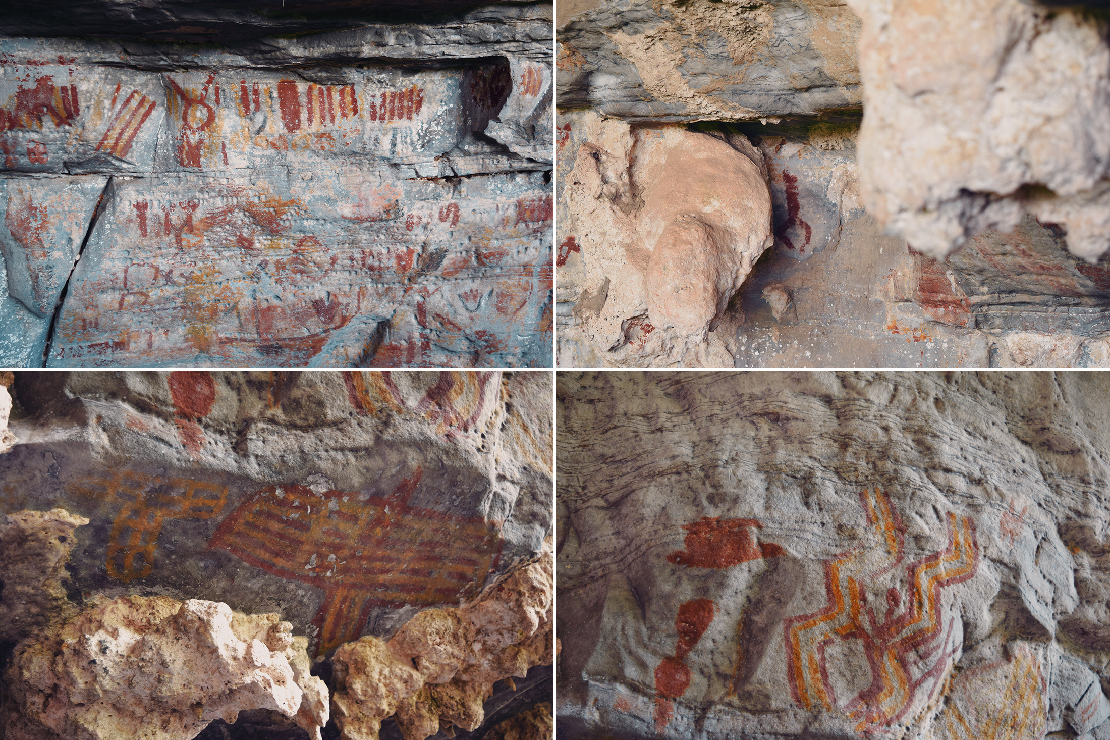 Researchers have identified four moments within the São Francisco Tradition: The first is simple and largely monochrome. The second marks the full emergence of the tradition, with extensive use of red-and-yellow bichromy and an expanded range of themes. The third reduces thematic diversity but intensifies chromatic complexity, introducing tri- and quadricolored figures (polychromy at its most whole form) and new motifs. The fourth moment represents an explosion of color use, the introduction of white made from calcite, and a renewed emphasis on “cartuchos”, nets, and lozenges, as well as other geometric forms, along with a broader range of supports and locations throughout the long valley. Across these moments, choices of site and support were clearly not random. Large, regular, vertical walls were preferred early on, often in secondary canyons or at elevated points distant from the river. Later phases expanded into irregular floors, ceilings, and previously occupied sites, indicative not necessarily of territorial expansion but of a reworking of an already meaningful landscape. Curiously, there is no rock art inside the caves, even within those that receive sunlight for kilometers, such as Janelão, thanks to clearings formed by sinkholes or collapsed ceilings that provide enough light for tropical vegetation to grow. Rock art also isn’t found in the aphotic zones of Peruaçu’s many deep caves. The colossal karst caves, in many ways reminiscent of those from the limestone plateau around the Ardèche River in France, home to Chauvet-Pont-d’Arc, might have seemed an obvious site for paintings. Yet, in almost 12.000 years, the denizens of the Peruaçu Valley apparently never ventured into the deep, pitch-dark recesses of these caves. The reasons may remain forever unknown. Perhaps the staggering abundance of brown recluse spiders, among the deadliest in the world, inside all caves acted as a deterrent. Yet it is almost certain that these prehistoric populations possessed their own understanding of the subterranean world, which decisively shaped their choice not to paint in the cave depths.