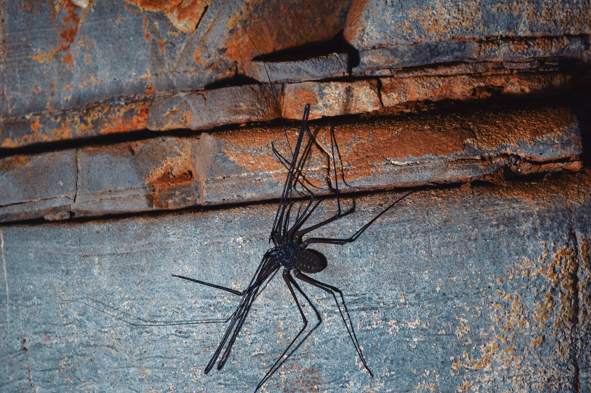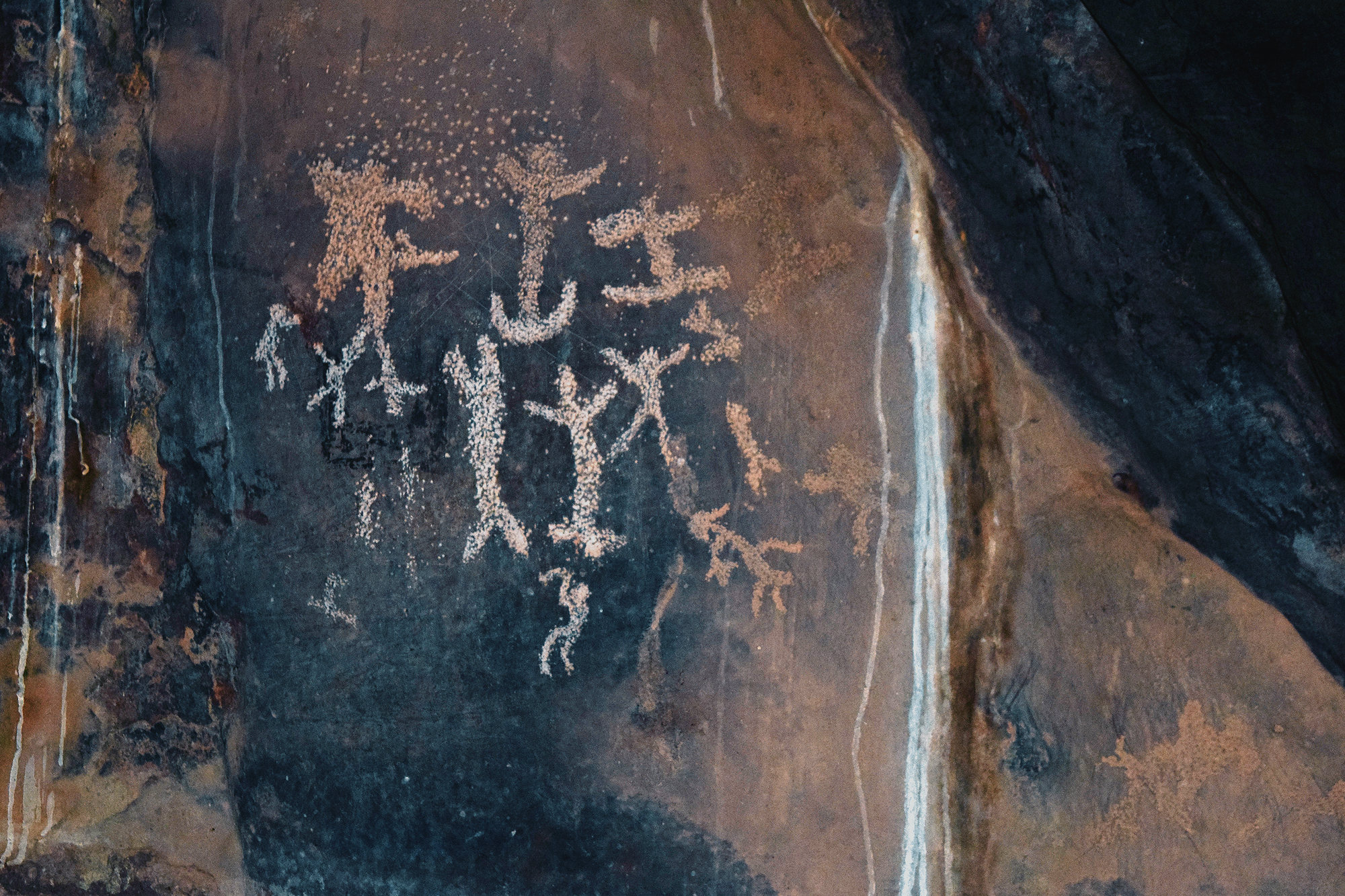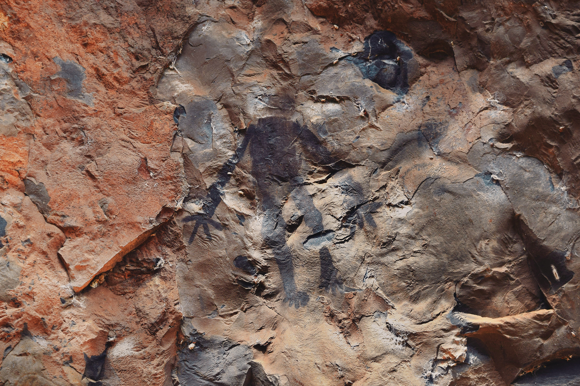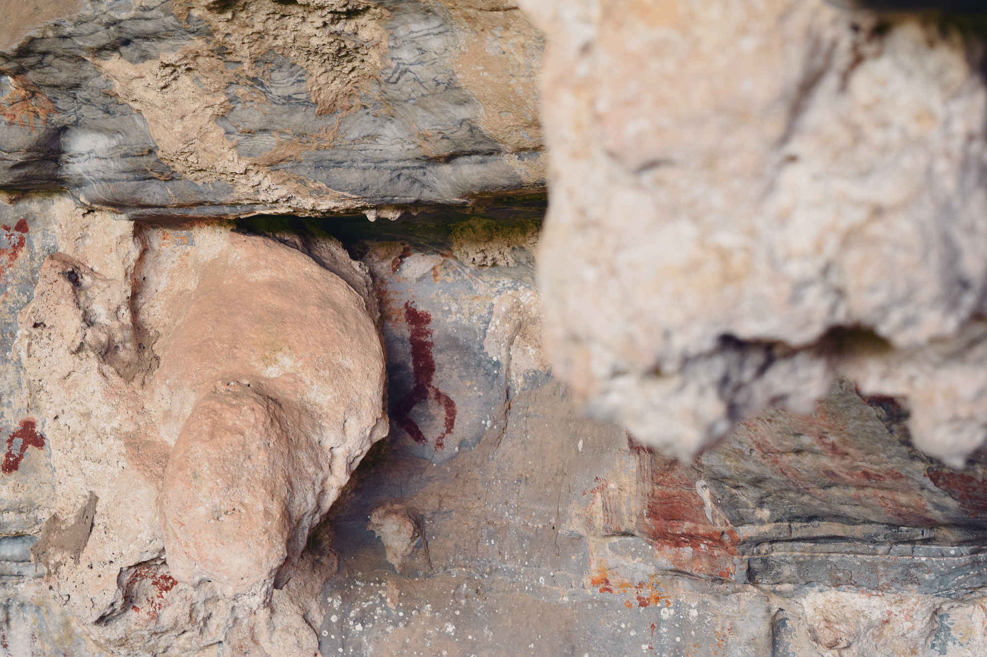 Researchers have identified four moments within the São Francisco Tradition: The first is simple and largely monochrome. The second marks the full emergence of the tradition, with extensive use of red-and-yellow bichromy and an expanded range of themes. The third reduces thematic diversity but intensifies chromatic complexity, introducing tri- and quadricolored figures (polychromy at its most whole form) and new motifs. The fourth moment represents an explosion of color use, the introduction of white made from calcite, and a renewed emphasis on “cartuchos”, nets, and lozenges, as well as other geometric forms, along with a broader range of supports and locations throughout the long valley. Across these moments, choices of site and support were clearly not random. Large, regular, vertical walls were preferred early on, often in secondary canyons or at elevated points distant from the river. Later phases expanded into irregular floors, ceilings, and previously occupied sites, indicative not necessarily of territorial expansion but of a reworking of an already meaningful landscape. Curiously, there is no rock art inside the caves, even within those that receive sunlight for kilometers, such as Janelão, thanks to clearings formed by sinkholes or collapsed ceilings that provide enough light for tropical vegetation to grow. Rock art also isn’t found in the aphotic zones of Peruaçu’s many deep caves. The colossal karst caves, in many ways reminiscent of those from the limestone plateau around the Ardèche River in France, home to Chauvet-Pont-d’Arc, might have seemed an obvious site for paintings. Yet, in almost 12.000 years, the denizens of the Peruaçu Valley apparently never ventured into the deep, pitch-dark recesses of these caves. The reasons may remain forever unknown. Perhaps the staggering abundance of brown recluse spiders, among the deadliest in the world, inside all caves acted as a deterrent. Yet it is almost certain that these prehistoric populations possessed their own understanding of the subterranean world, which decisively shaped their choice not to paint in the cave depths.