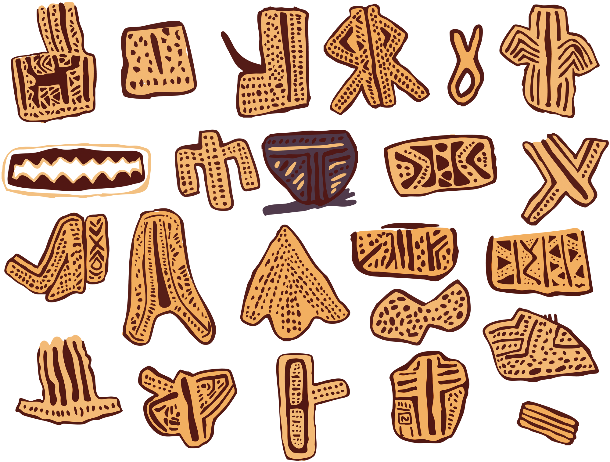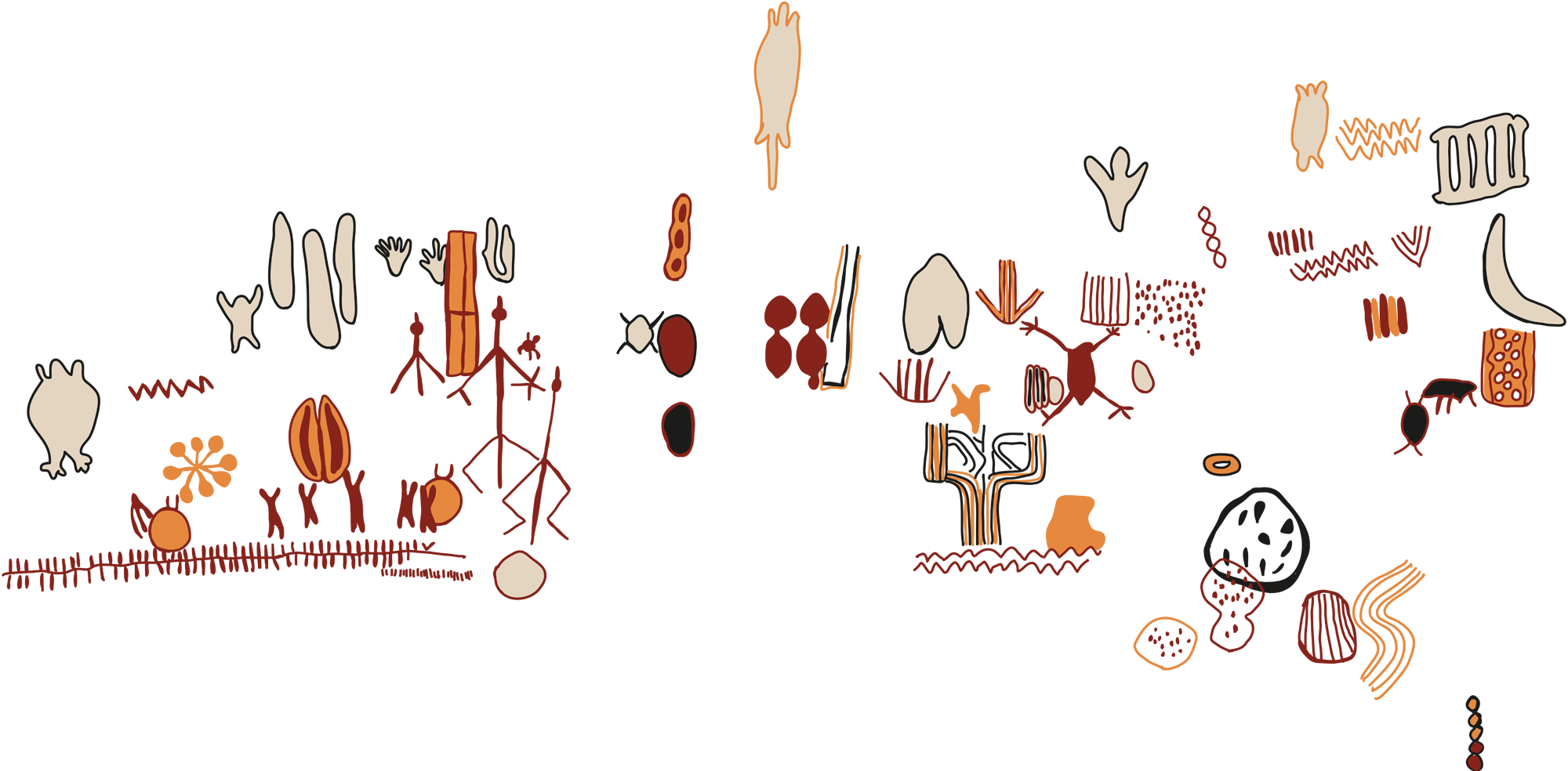 The most emblematic motif type in Peruaçu is the “cartucho”: oval, flat, escutcheon-like figures filled with one color and outlined in another, a form not identified in other Brazilian stylistic units or rock art traditions. Other recurring motifs include short parallel lines, grids, nets, zigzags, lozenges, and “plain” figures. Figurative elements such as weapons, biomorphs, anthropomorphs, and zoomorphs (e.g., fish and lizards) are present but in smaller numbers. However, due to the enormous number of figures, they still account for a few hundred motifs.