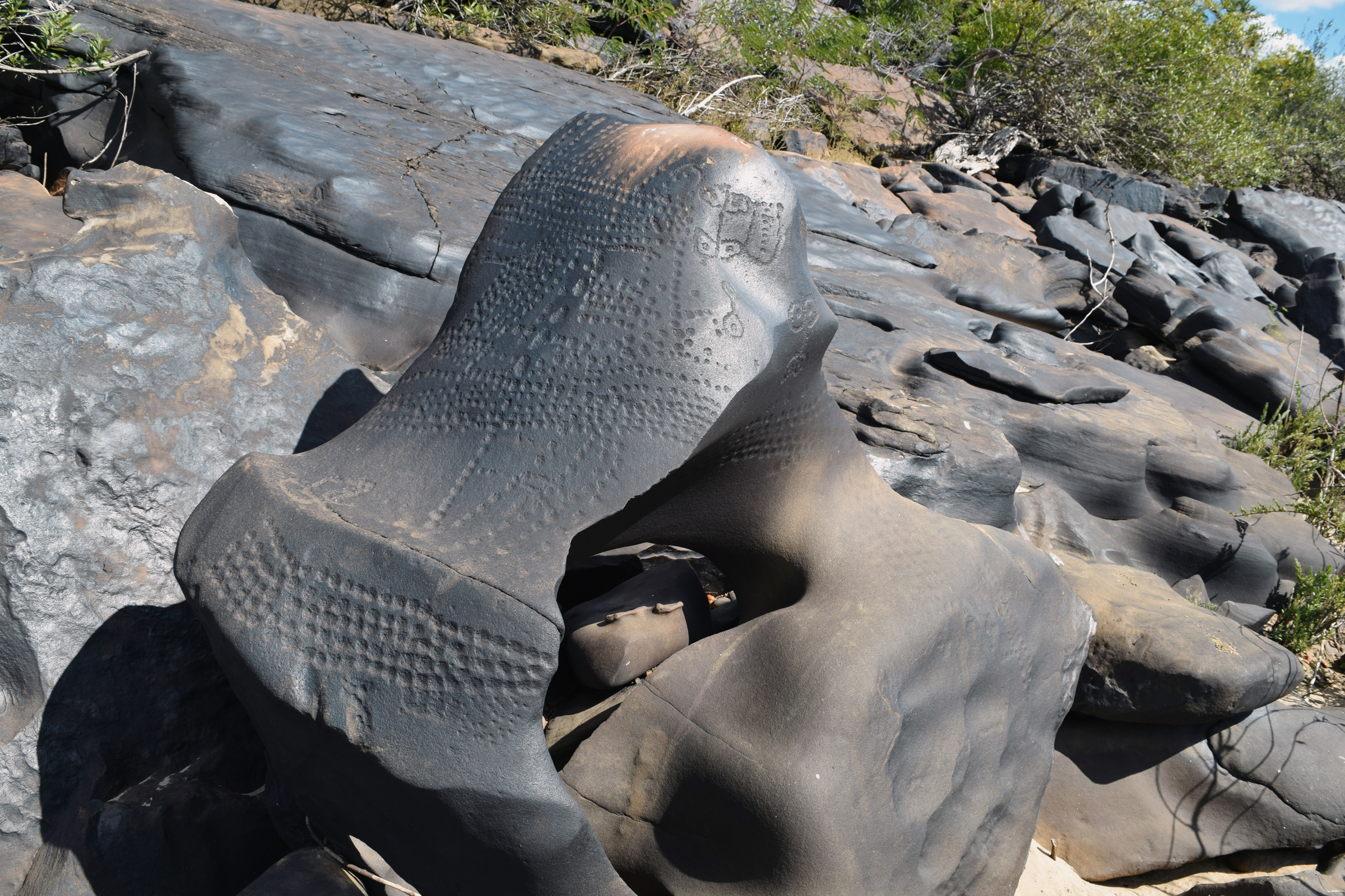 The surface composition of the Throne forms a structured, harmonious visual field: sequences of cupules create ascending and descending movements, while aligned groups produce a sense of symmetrical balance. Specific figures illustrate visual rhythm and perceptual tension. The interplay of ordered and vestigial forms reveals both deliberate design and entropy. The sheer number of engravings, the size and unusual shape of this boulder, and its prominent position low on the west margin make it a focal point in the canyon’s petroglyph landscape. However, as it lies almost at riverbed level, it is visible only when the water level is at its lowest, a condition that does not occur every year and requires an episode of extreme drought.