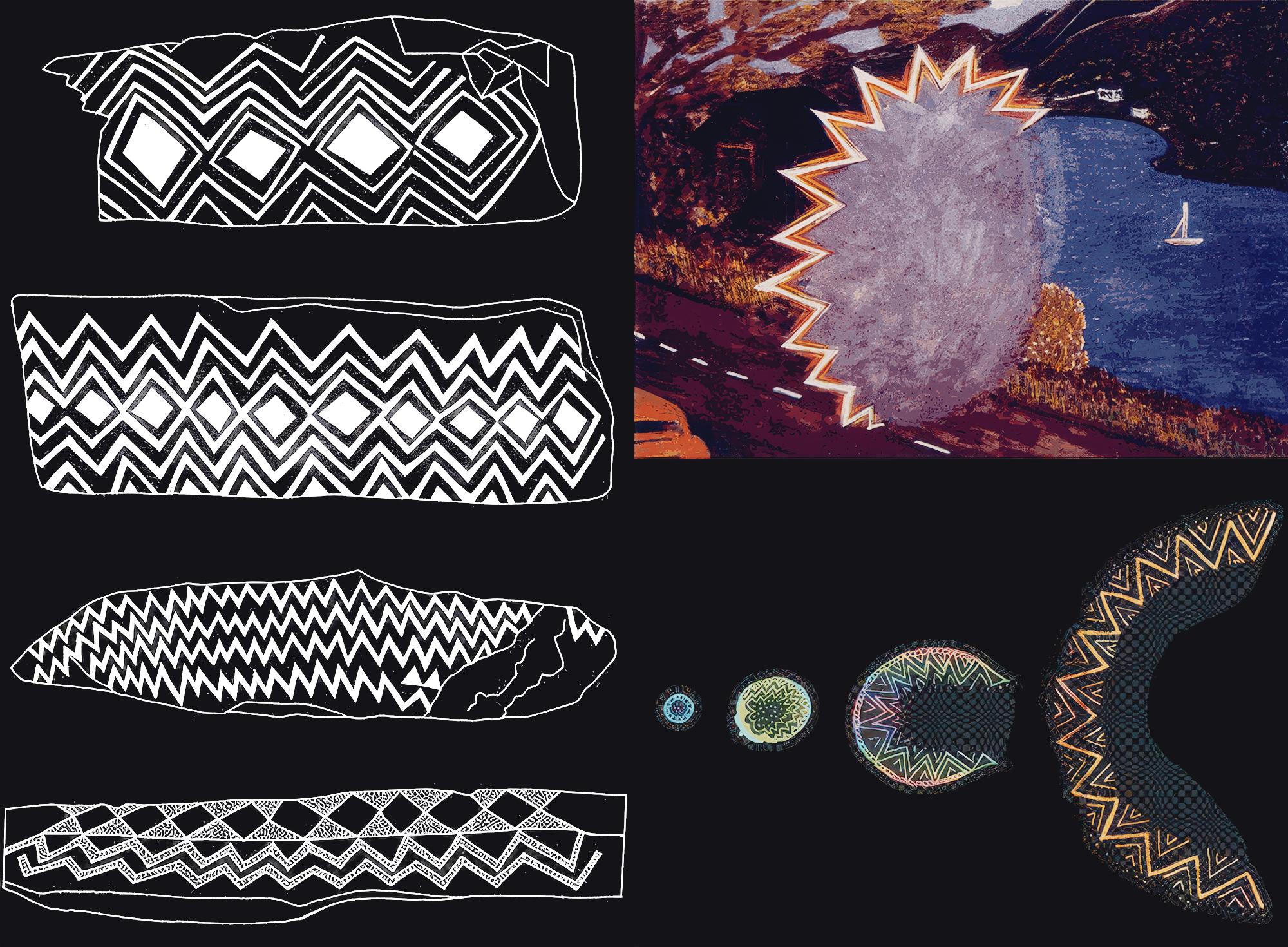 Other examples of drug-free hallucinations are the dynamic, jagged geometric patterns called 'fortification patterns' that often accompany migraine headaches. The image of jagged patterns around a dark visual 'hole in the universe' bears a striking resemblance to the manner in which the entry portals into the Passage tombs in Ireland were decorated. The decorated lintel stones placed over the dark entrance tunnels into the tombs may be a direct representation of patterns seen by the artists. Are there hallucinations that correspond to the other geometric forms besides those induced by migraines?
