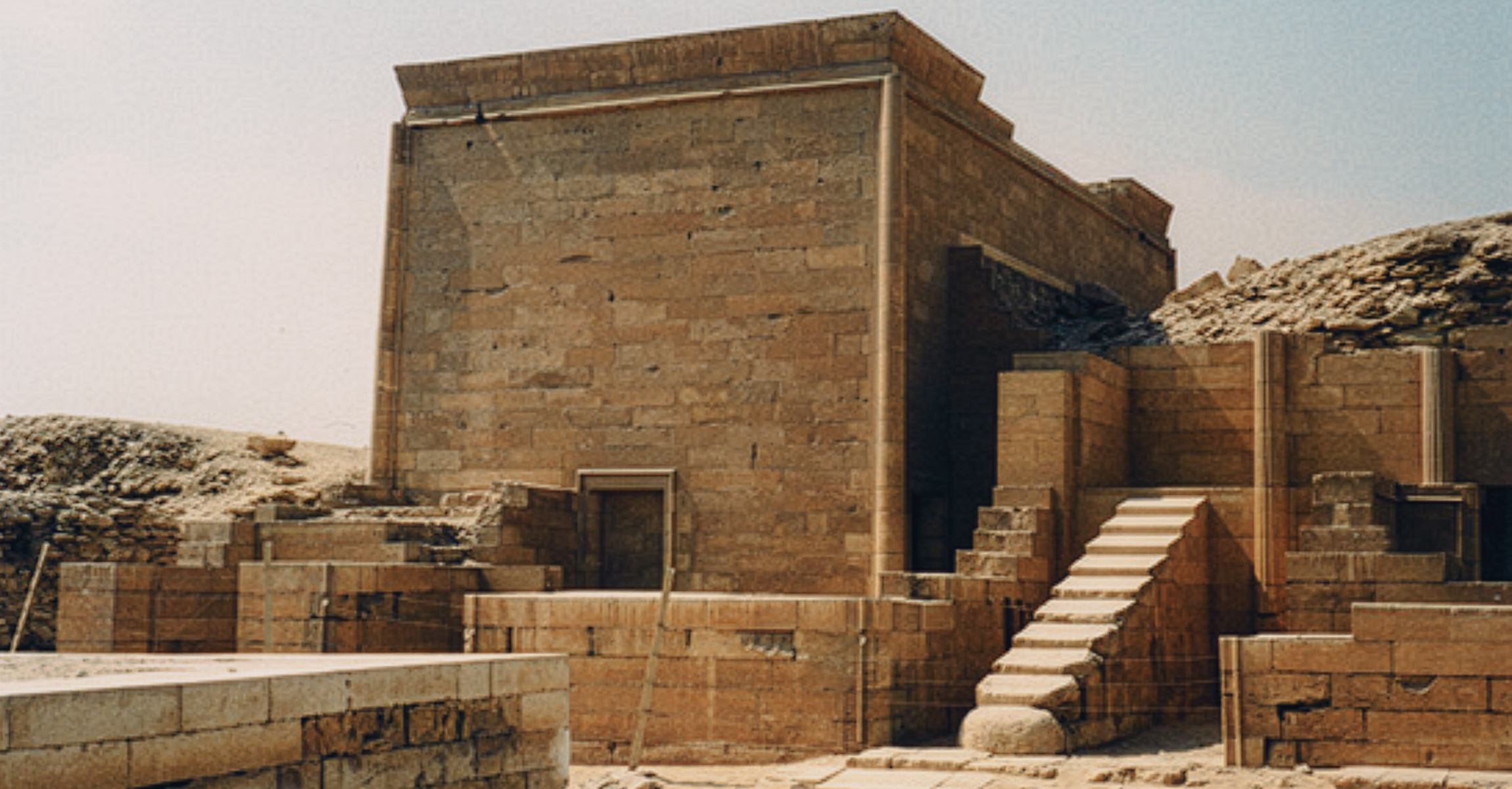 This chamber, or mastaba, was rare in that it was square, rather than the conventional rectangular. The royal tomb is 28m underground with a vertical shaft leading to it. The entrance was sealed with a 3 ton piece of granite. The face of the mastaba was a fine tura limestone. Apparently it was intended for this to be the finishing touche to the building. It was then enlarged all around with ten feet of additional limestone and then again with an extension on the eastern side. The extension was twenty-five feet of limestone to make the mastaba rectangular. Again, it was enlarged and a two-tiered structure was made. A series of corridors and a tomb chamber was dug. Some of the chambers are lined with blue tiles.