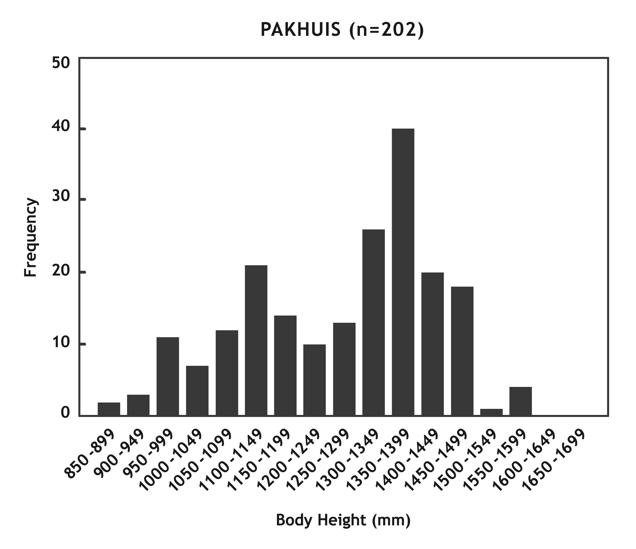 Body heights were reconstructed for the south-western Cape hand print sample using the regressions of Henneberg & Mathers (1994). The reconstructions for the two different areas are presented graphically in Fig. 7 with the data summarised in Table 4. The range is similar in both areas but with the Pakhuis showing a shift towards smaller body size. This is also reflected in the means. However, as the samples are not normally distributed, the mode is probably a better indicator than the mean. The Sandveld sample portrays a basically unimodal distribution with a single mode at 1 350 - 1 399 mm. In contrast, the Pakhuis sample has a bimodal tendency with a minor mode at 1 100-1 1149 mm and a major mode at 1 350 - 1 399 mm. This has implications for the age reconstruction discussed below.