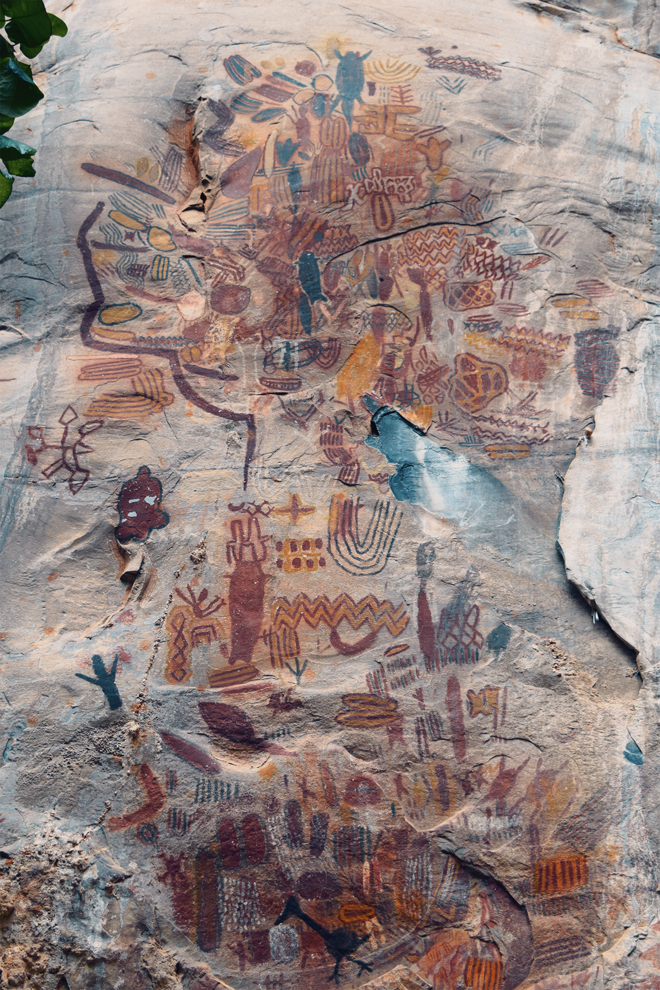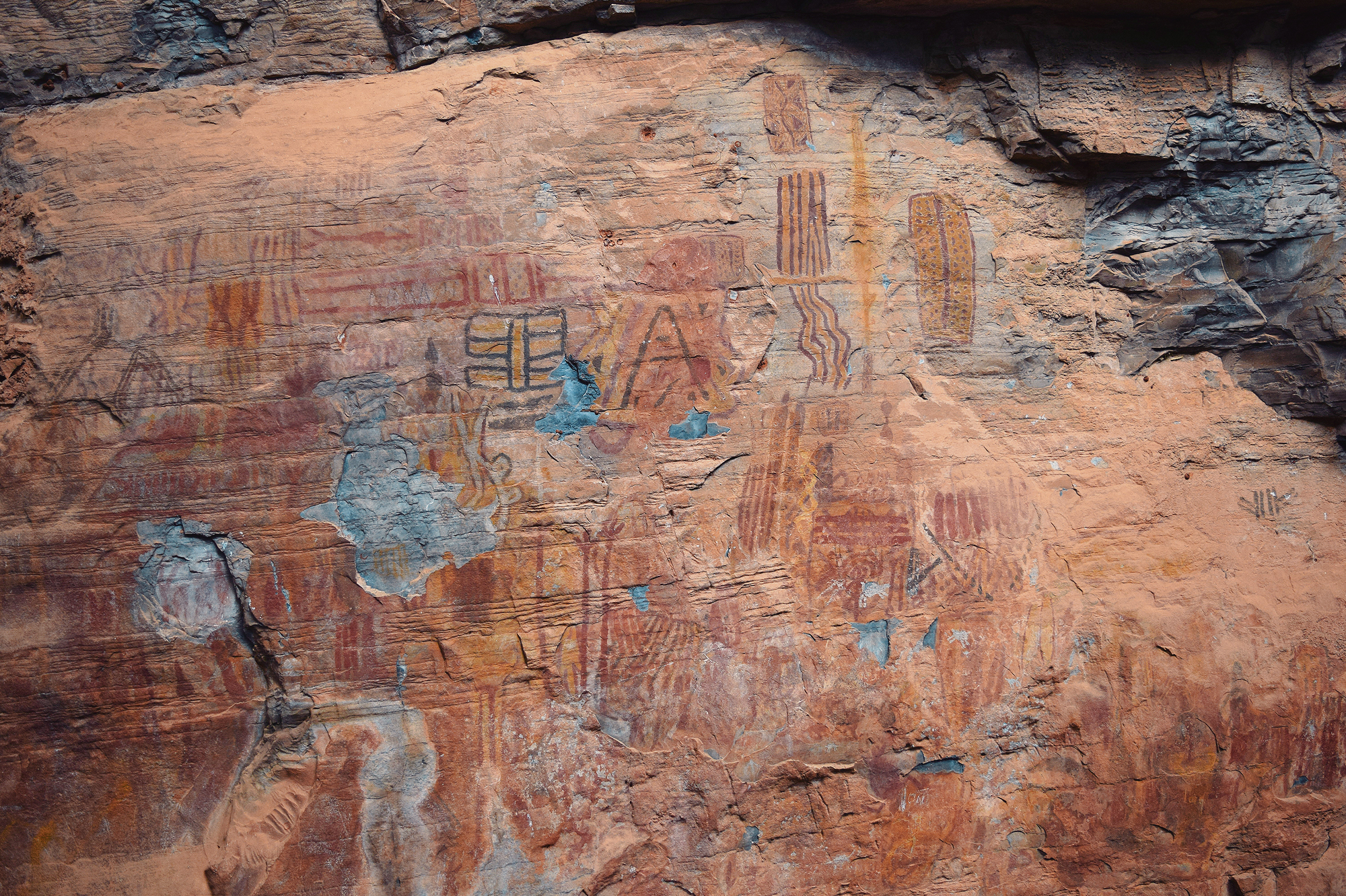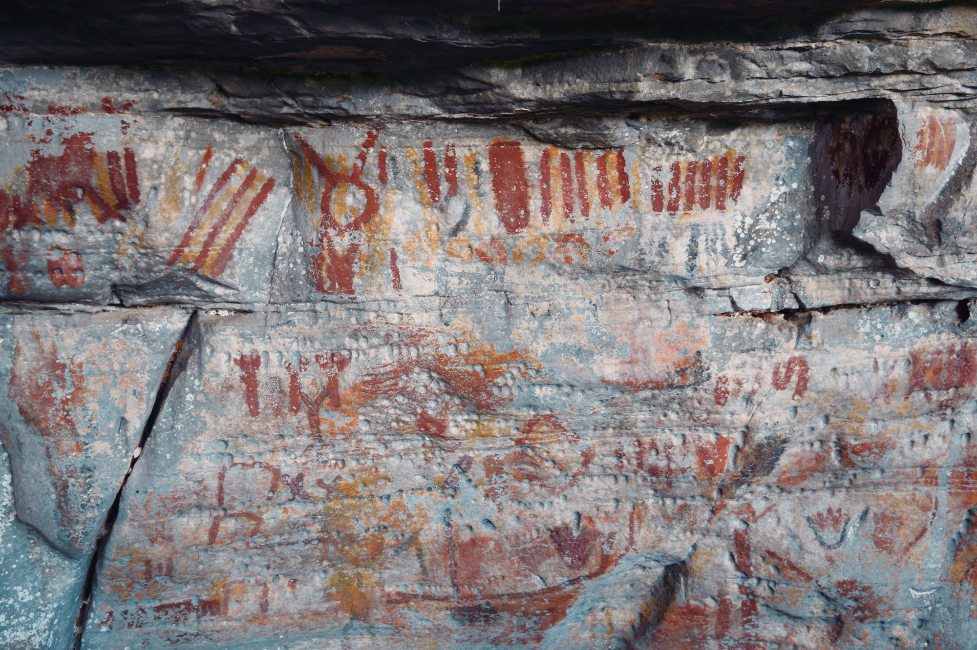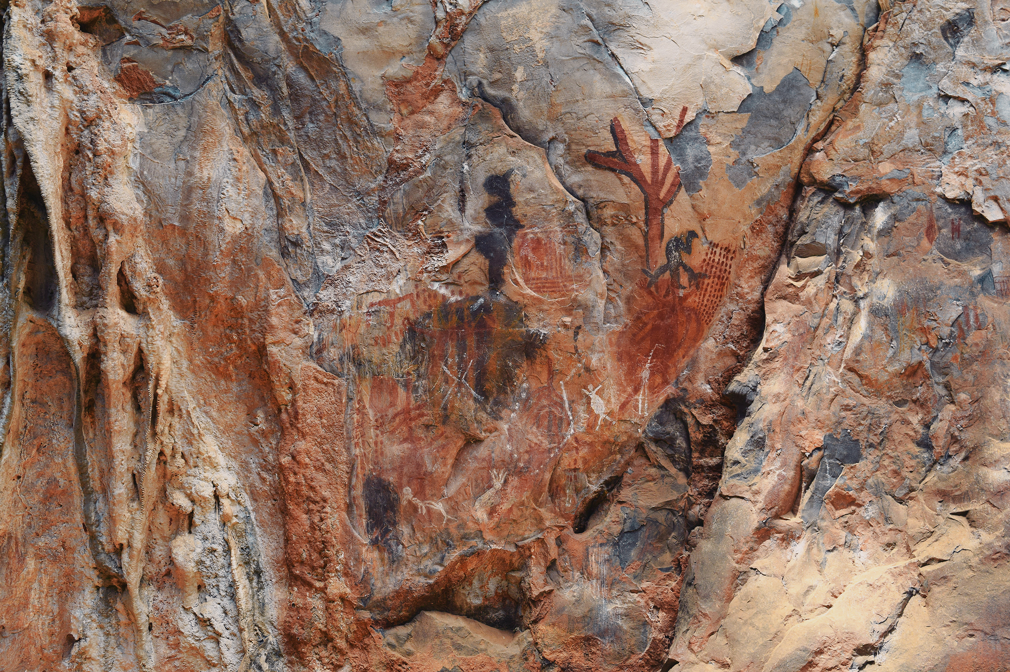 What immediately distinguishes Peruaçu from most Brazilian rock-art regions is its chromatic scope and scale. While red dominates painted rock art painting elsewhere, Peruaçu’s art is fundamentally polychromatic. Red, orange, yellow, white, and black, along with intermediate tones, were produced using charcoal, manganese dioxide, iron oxides and hydroxides, calcite, and carbon. This incredibly colorful corpus of paintings is sometimes placed as high as a 6-story building, a feat which evidently required scaffolding, ropes, or climbing trees and their branches. Research in the Peruaçu region began in the 1980s under the Archaeology Sector of the Federal University of Minas Gerais (UFMG). The initial goal was to characterize the paintings and define their stylistic units. Because the valley presents a dense, synchronous superposition of images, researchers adopted a crono-stylistic approach, seeking to disentangle stylistic affinities and relative chronologies.