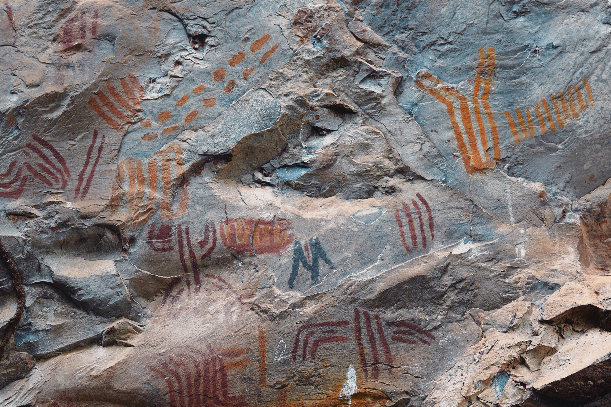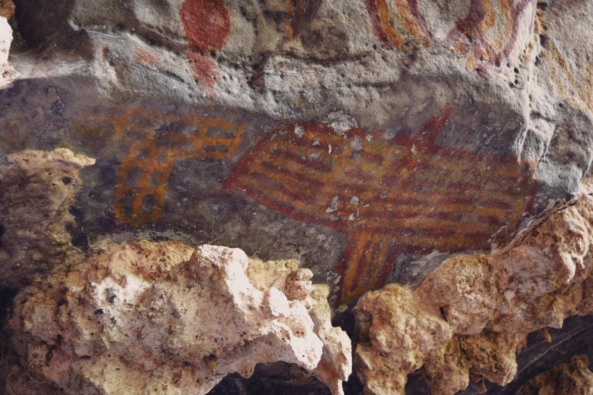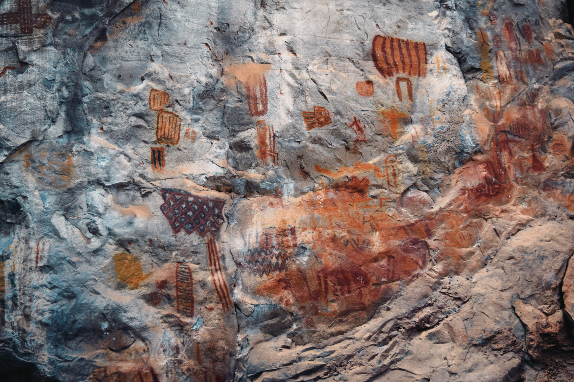 Researchers have identified four moments within the São Francisco Tradition: The first is simple and largely monochrome. The second marks the full emergence of the tradition, with extensive use of red-and-yellow bichromy and an expanded range of themes. The third reduces thematic diversity but intensifies chromatic complexity, introducing tri- and quadricolored figures (polychromy at its most whole form) and new motifs. The fourth moment represents an explosion of color use, the introduction of white made from calcite, and a renewed emphasis on “cartuchos”, nets, and lozenges, as well as other geometric forms, along with a broader range of supports and locations throughout the long valley. Across these moments, choices of site and support were clearly not random. Large, regular, vertical walls were preferred early on, often in secondary canyons or at elevated points distant from the river. Later phases expanded into irregular floors, ceilings, and previously occupied sites, indicative not necessarily of territorial expansion but of a reworking of an already meaningful landscape. Curiously, there is no rock art inside the caves, even within those that receive sunlight for kilometers, such as Janelão, thanks to clearings formed by sinkholes or collapsed ceilings that provide enough light for tropical vegetation to grow. Rock art also isn’t found in the aphotic zones of Peruaçu’s many deep caves. The colossal karst caves, in many ways reminiscent of those from the limestone plateau around the Ardèche River in France, home to Chauvet-Pont-d’Arc, might have seemed an obvious site for paintings. Yet, in almost 12.000 years, the denizens of the Peruaçu Valley apparently never ventured into the deep, pitch-dark recesses of these caves. The reasons may remain forever unknown. Perhaps the staggering abundance of brown recluse spiders, among the deadliest in the world, inside all caves acted as a deterrent. Yet it is almost certain that these prehistoric populations possessed their own understanding of the subterranean world, which decisively shaped their choice not to paint in the cave depths.