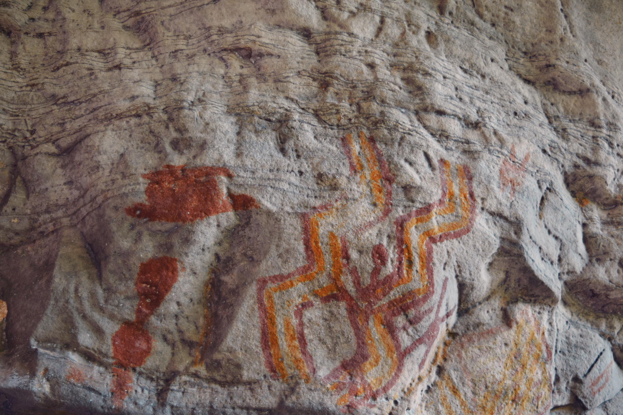 Excavations at the Lapa do Boquête site yielded radiocarbon dating indicating human occupation dating back almost 12.000 years before present. Furthermore, six burials were identified, dating to around 7.000 years before present, along with stone artifacts and structural features interpreted as habitation remains. The site preserves rock art panels combining both paintings and petroglyphs, comprising geometric designs as well as zoomorphic and anthropomorphic figures. Of particular interest is the large red Caboclo motif, along with a myriad of geometric designs in red, orange, purple, yellow, and black.