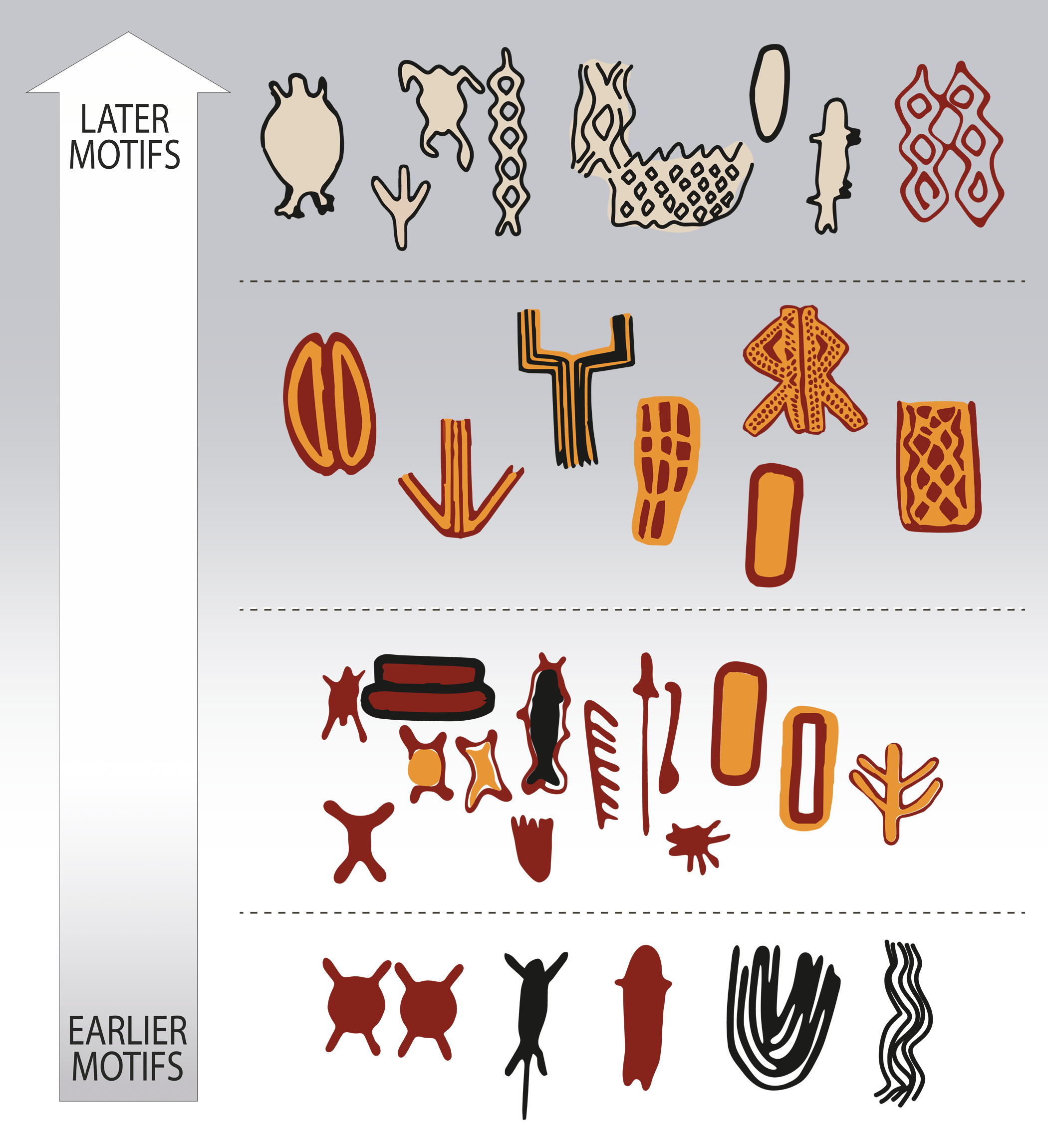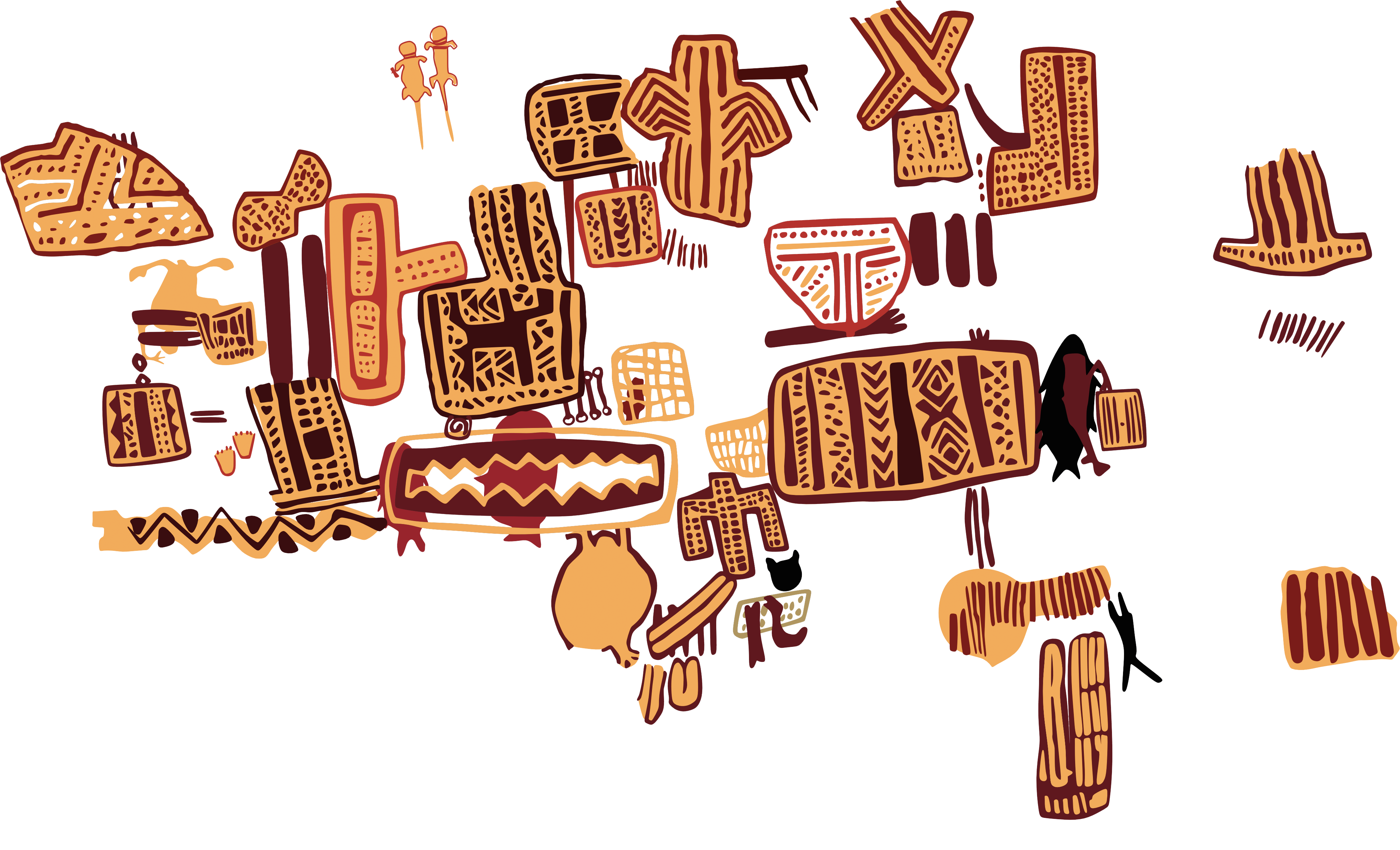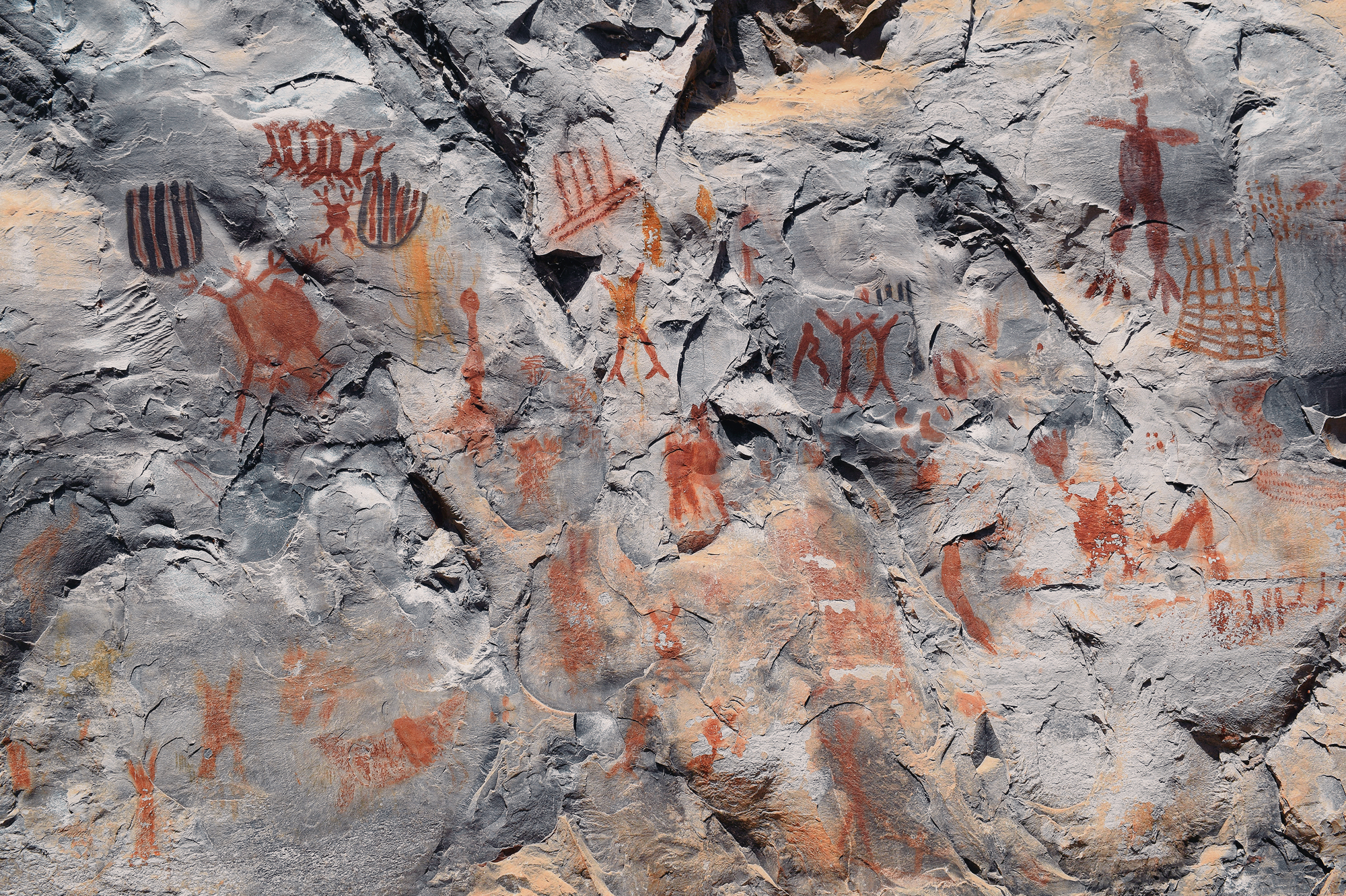 The most emblematic motif type in Peruaçu is the “cartucho”: oval, flat, escutcheon-like figures filled with one color and outlined in another, a form not identified in other Brazilian stylistic units or rock art traditions. Other recurring motifs include short parallel lines, grids, nets, zigzags, lozenges, and “plain” figures. Figurative elements such as weapons, biomorphs, anthropomorphs, and zoomorphs (e.g., fish and lizards) are present but in smaller numbers. However, due to the enormous number of figures, they still account for a few hundred motifs.