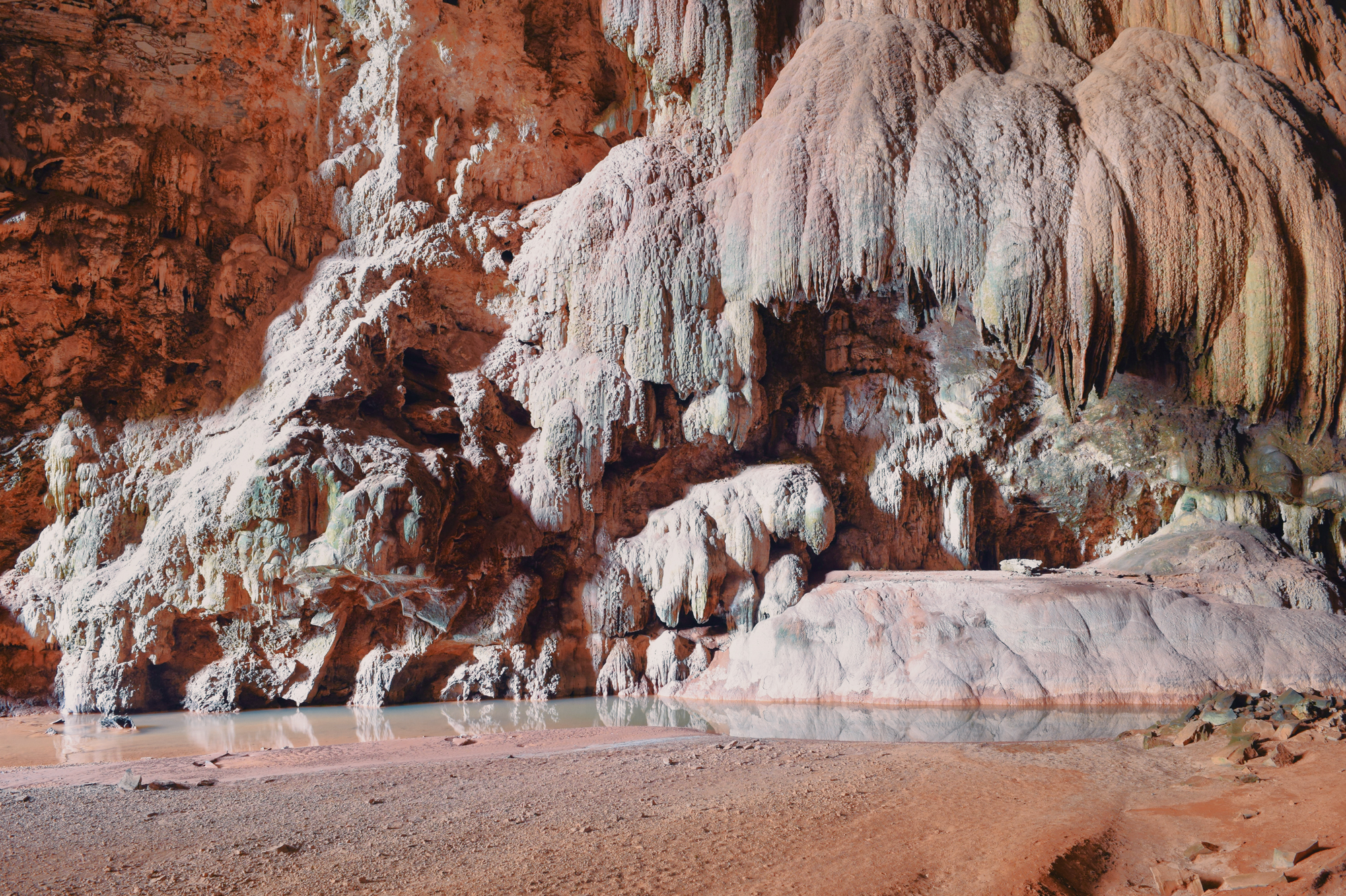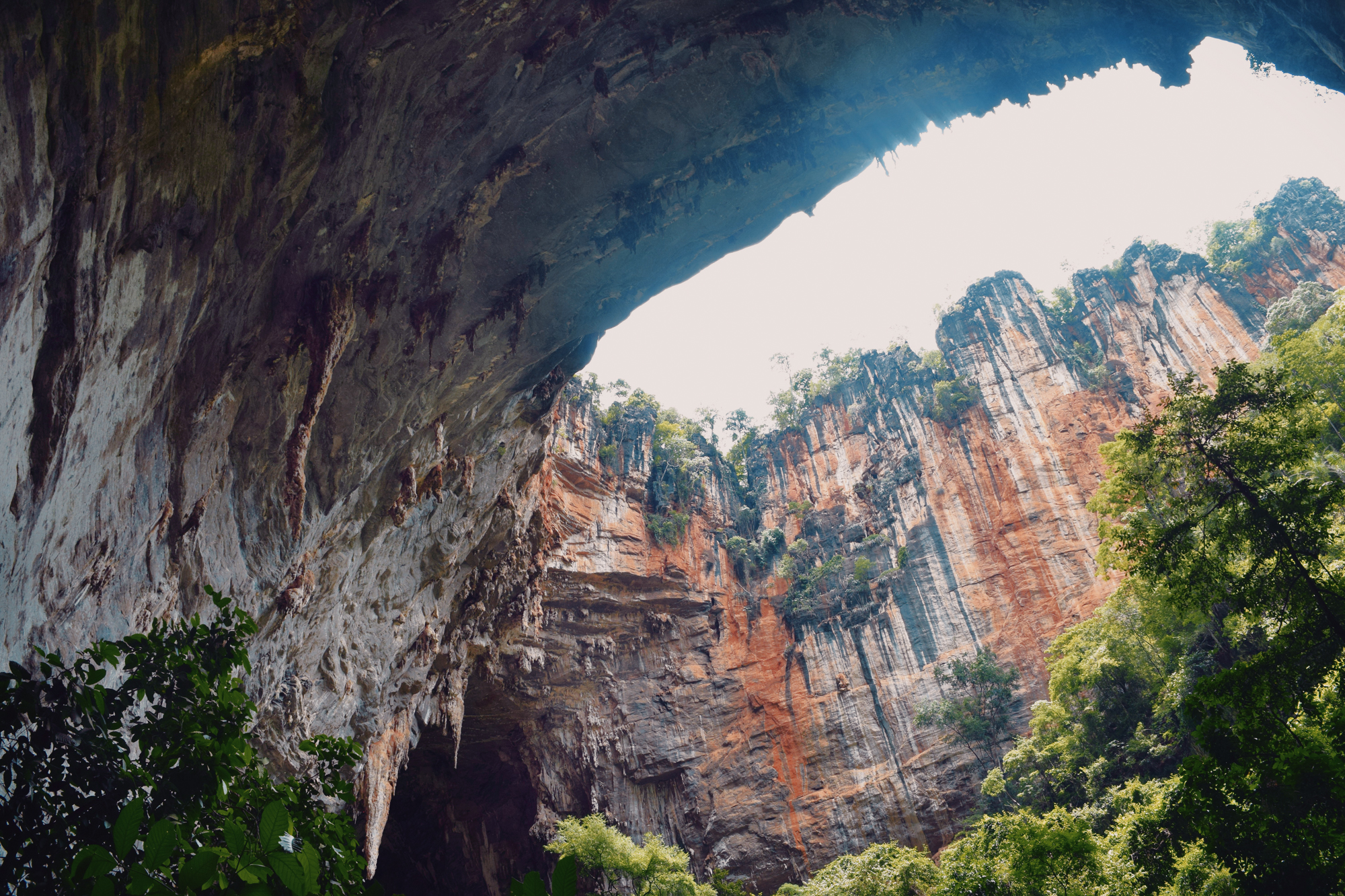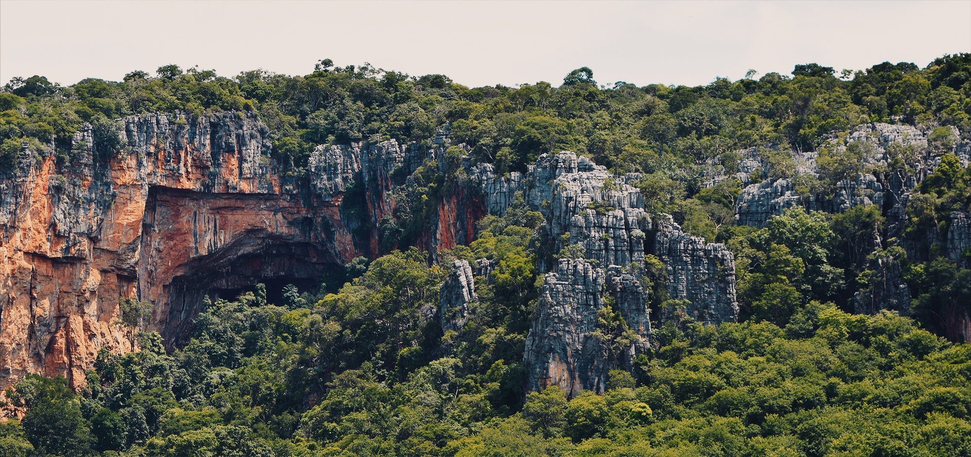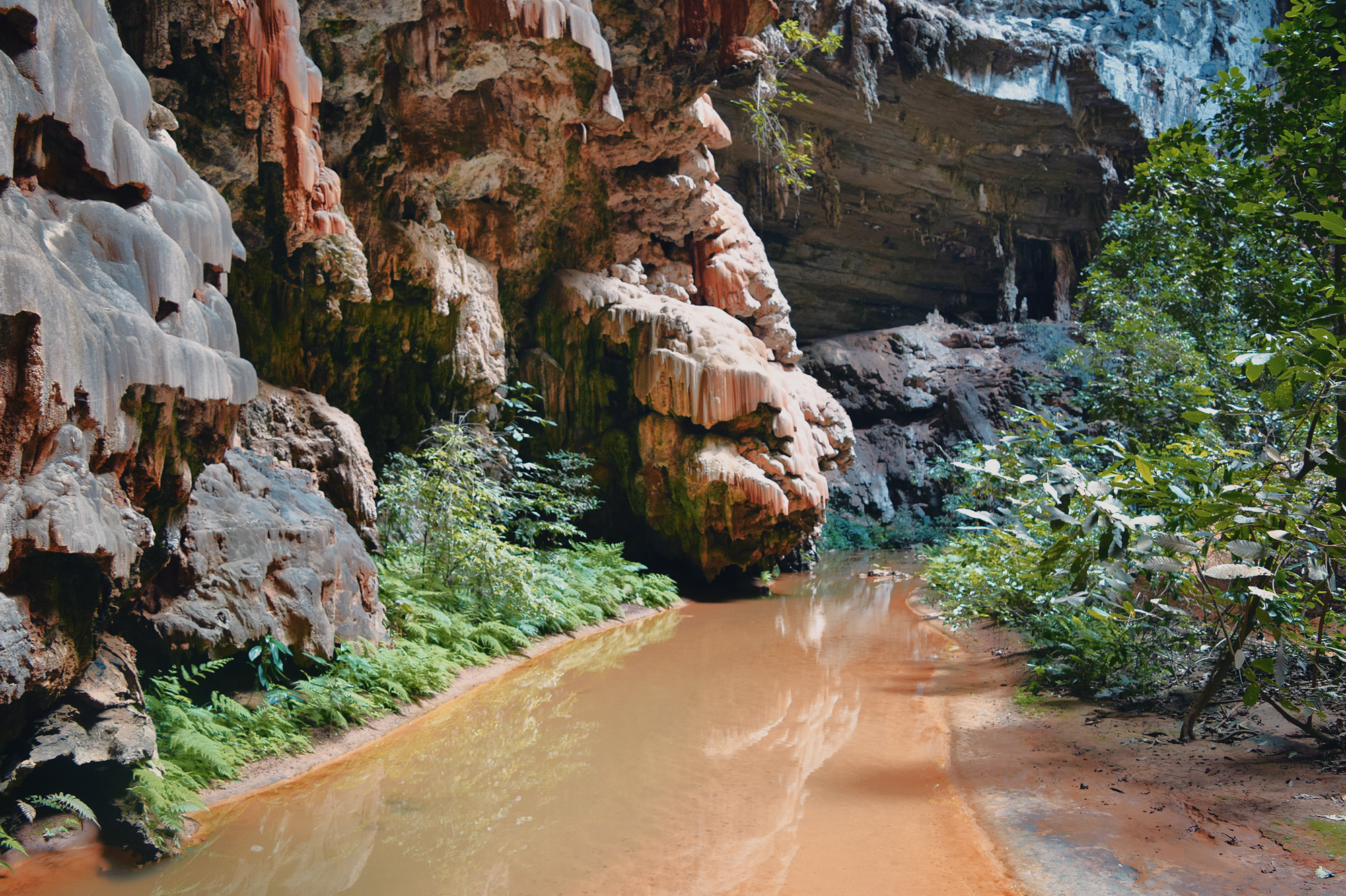 At the cave’s entrance, a towering rock wall forms an open-air panel, where extensive rock art compositions can be observed. Known as the Janelão atelier, these rock art panels are placed approximately 3 meters high and are notable for their bold, striking colors. From the Atelier, a large doline functions as a natural window, offering panoramic views of the cave entrance and the first of several skylights. These punctuate approximately 3.5 kilometers of passages adorned with stalactites, stalagmites, and numerous rare speleothemes, made all the more remarkable by their visibility in full daylight thanks to collapsed sections of the ceiling.