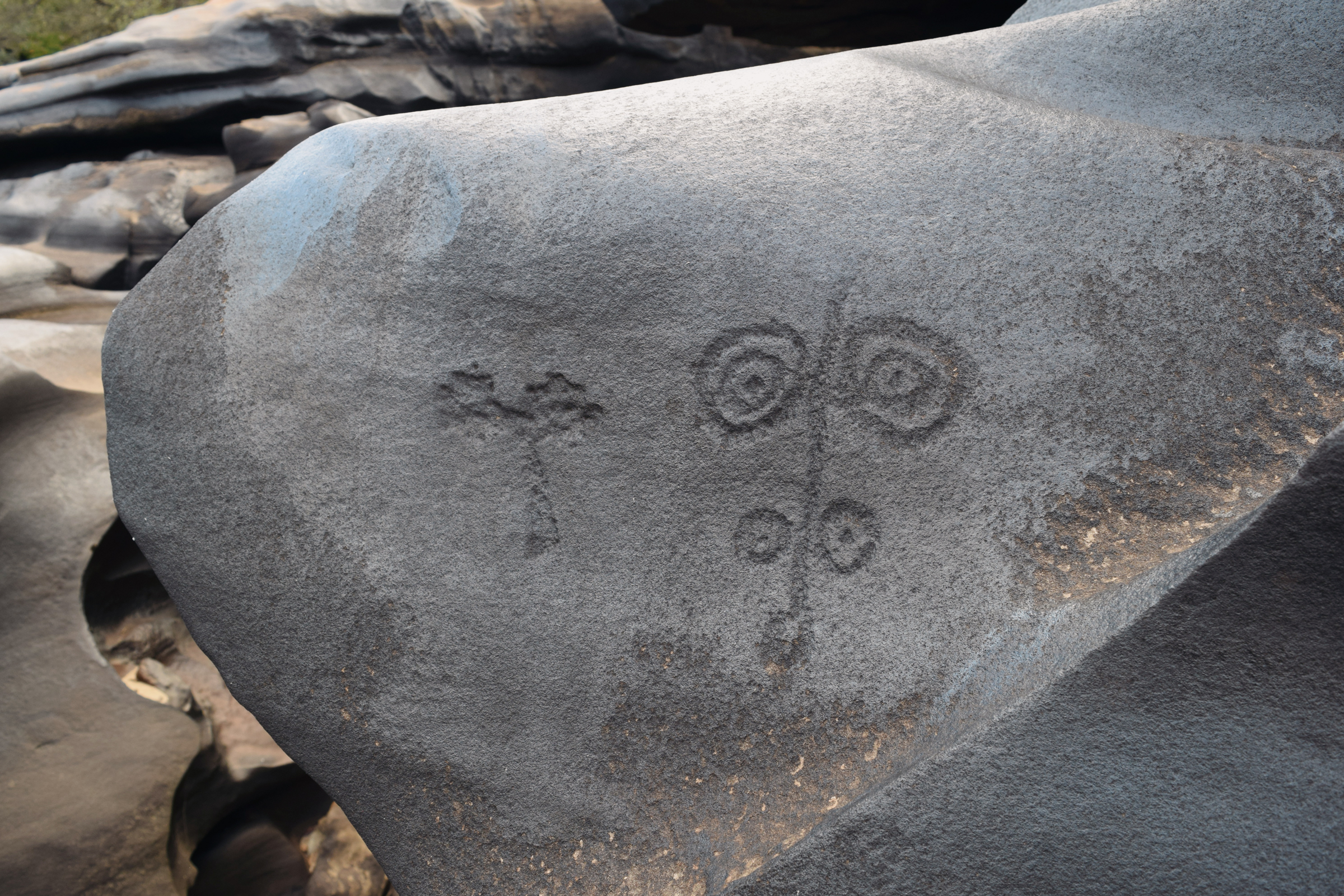 This visual duality, part butterfly, part vision, suggests perception, metamorphosis, and spiritual guardianship. So persuasive is this impression that local residents call these motifs the “River Guardians”. The images flow with the stone itself, tracing its natural curves and reinforcing the Gestalt principles of unity and continuity, as though the canyon were populated by watchful presences. In these petroglyphs, the engravers achieved a rare synthesis. The Butterfly-Eyes express the site’s material intelligence and open a dialogue between seeing and being seen: to paraphrase Nietzsche, if you gaze long into the canyon, the canyon gazes also into you.