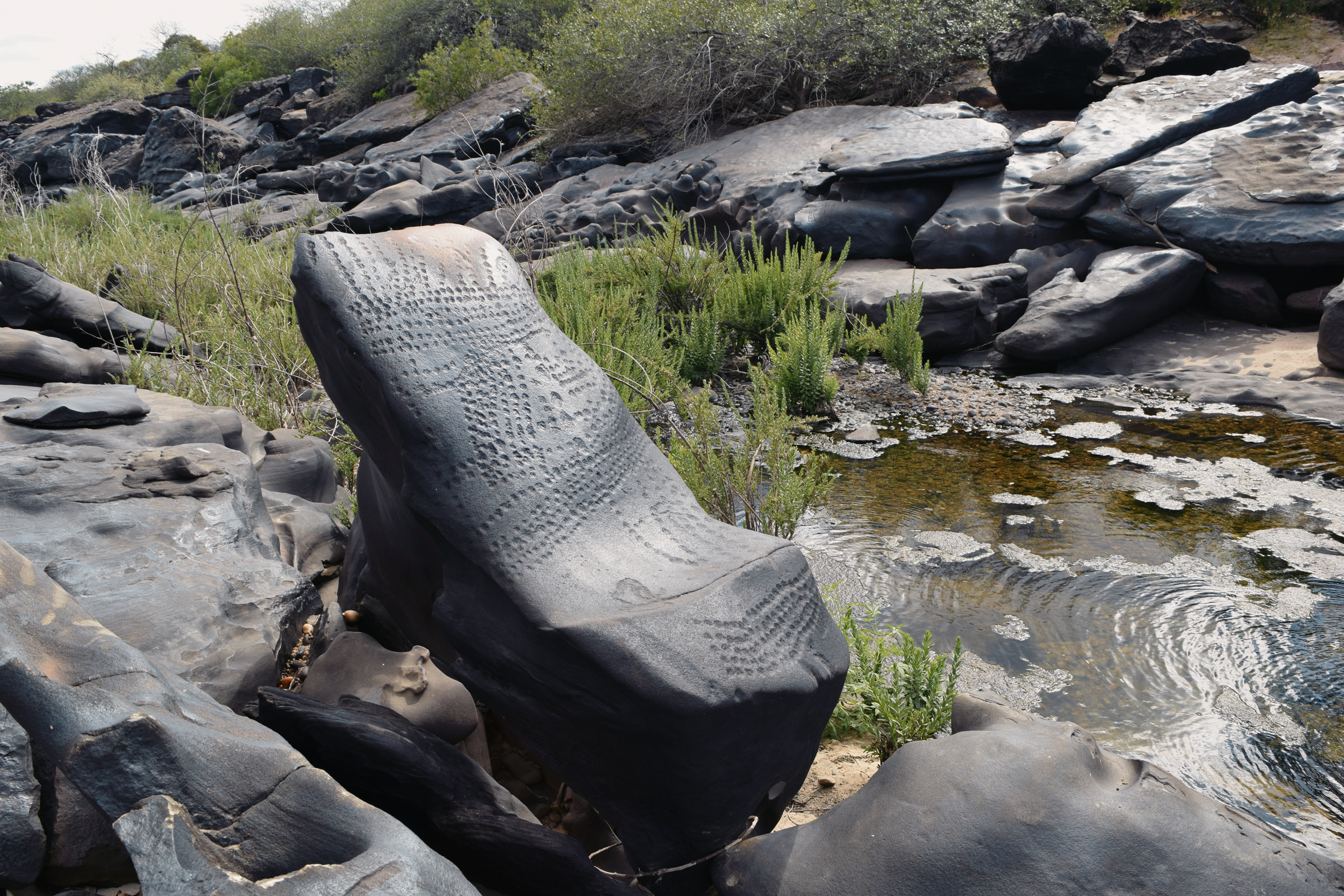 An isolated, chair-shaped block measuring 1.50 m in height and 1.10 m at the base, “The Throne” is fully engraved on its frontal face, predominantly with cupules. Despite severe erosion on its upper and lower right sections, the engravings retain remarkable legibility. The sharpened edge on the right side, together with the color difference and the abrupt interruption of the engraved composition, suggests that the “throne” was broken during a submersion event, with its missing portion likely struck by debris carried in the current and subsequently swept downstream. This unfortunate incident probably occurred a couple of decades, if not centuries ago. The color contrast and sharpness of the fracture indicate a relatively recent loss, yet the edge and the surface have already been partially smoothed by water, a process that requires countless episodes of submersion. The Throne, despite being hewn from solid rock, is not indestructible. This fact only magnifies the need for photogrammetric recording and digital preservation (to be discussed subsequently), as each rainy season carries the risk of irreversible damage.