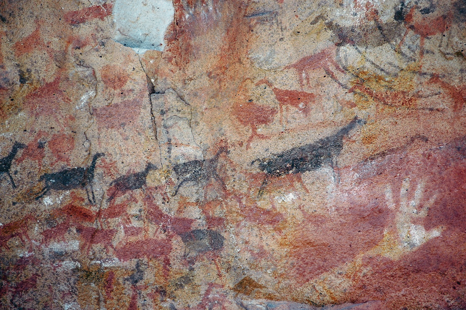 The hunting scenes portray a variety of hunting techniques, including the use of 'bolas' - a throwing weapon made of weights on the ends of interconnected cords, designed to capture animals by entangling their legs. In one panel a crack in the rock is used to represent a ravine that the hunters chase the animals into. Guanacos were the main source of food. Most of the painted hands are left hands, and of a size that resembles that of a 13-year-old boy; this may have been an initiation ceremony.