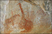 Scarlet red and light ocherous red pigments were used with the later overlying the former. On the basis of literal interpretation of the visual evidence, hunting and dancing seem to be the activities represented. Overall the site is still in a good state of preservation. The highest painting is 2.35m from ground level. Despite a high surface concentration of quartz chips comparable to LSA artifacts, the site does not seem stratified with archaeological deposits. It may also be of interest to note that there seems to have been a deliberate preferance to paint on the whitish part of the panel as opposed to the other portions. The white seems to be associated with evaporated salts deposited on the rock panel by rainwater.